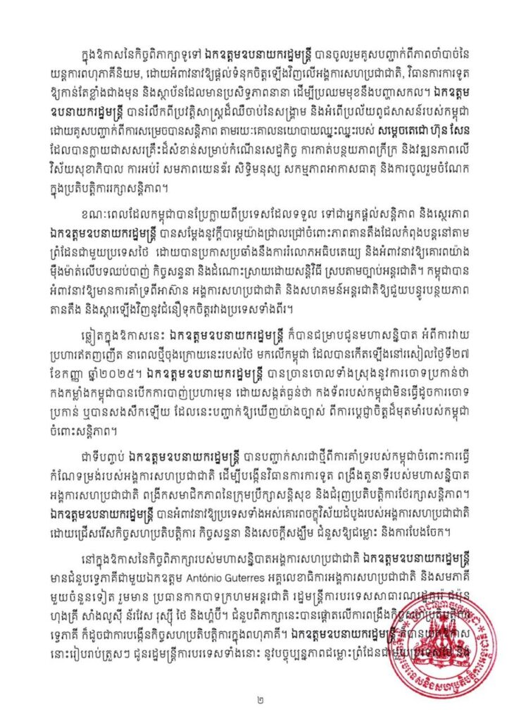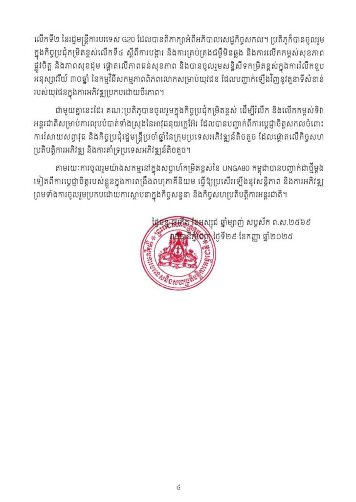 នេះបើយោងតាមសេចក្ដីប្រកាសព័ត៌មាន របស់ក្រសួងការបរទេស និងសហប្រតិបត្តិការអន្តរជាតិកម្ពុជា ចុះថ្ងៃទី២៩ ខែកញ្ញា ឆ្នាំ០២៥ ។
