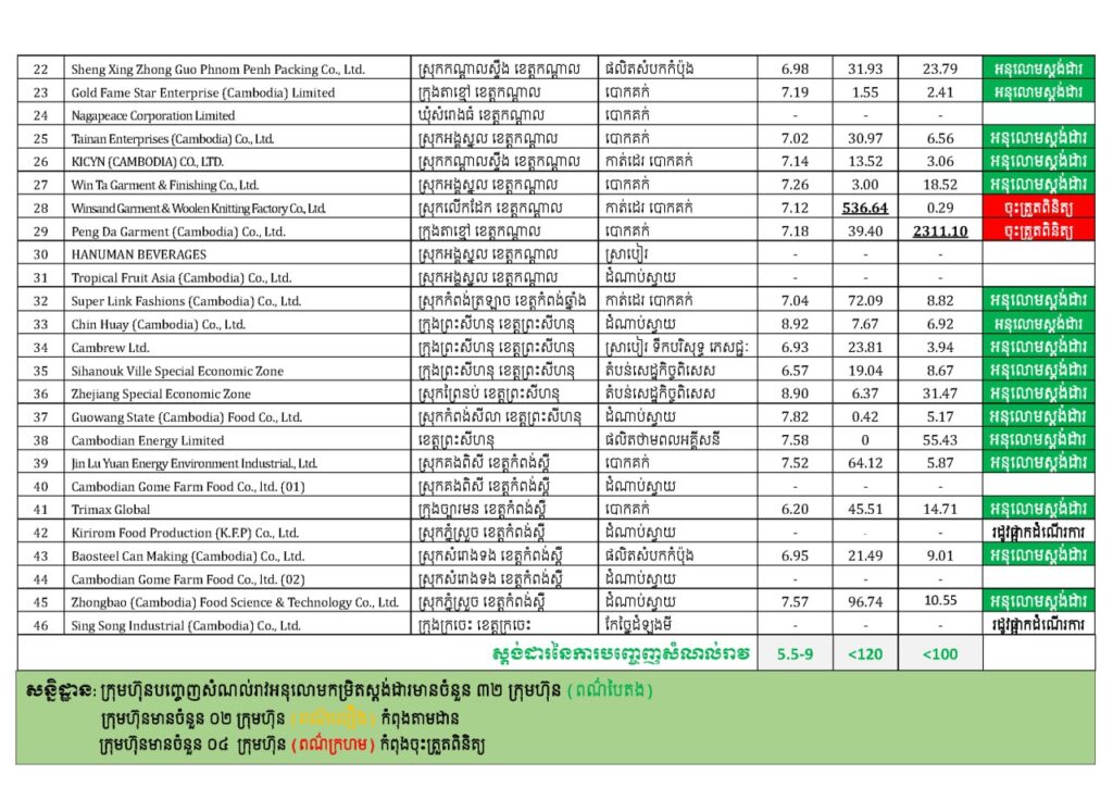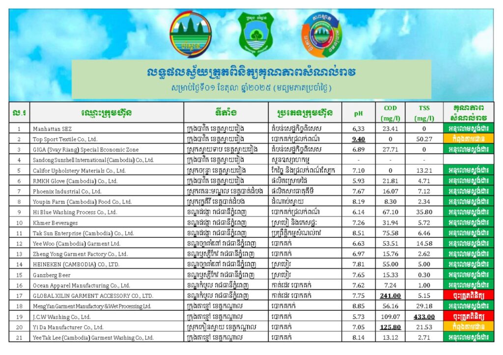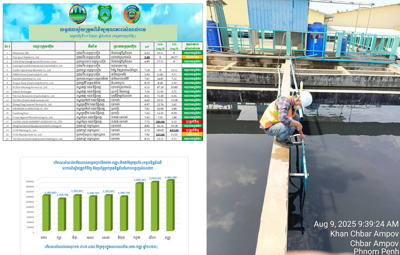 លទ្ធផលការវាយតម្លៃសន្ទស្សន៍គុណភាពទឹកជារួមគុណភាពទឹកសាធារណៈ និងតំបន់ងាយរងការបំពុលទឹក ស្ថិតក្នុងចំណាត់ថ្នាក់ល្អណាស់ និងល្អ និងដោយទ្បែកទឹកកខ្វក់សម្អាតរួចអនុលោមតាមស្តង់ដាបញ្ចេញចូលប្រភពទឹកសាធារណៈ។ ព្រមជាមួយគ្នានេះ ក្រុមការងារ បានចុះពិនិត្យ និងវាយតម្លៃការគ្រប់គ្រងសំណល់រាវ នៅទីតាំងស្នើសុំបញ្ចេញសំណល់រាវ ក្នុងរយៈពេល ២ឆ្នាំកន្លងមកនេះ បានចំនួនសរុប ១.៥៤៩ក្រុមហ៊ុន (ឆ្នាំ២០២៣ ចំនួន៤៦៥ ឆ្នាំ២០២៤ ចំនួន៦៧១ និង ឆមាសទី១ ឆ្នាំ២០២៥ ចំនួន៤១៣) ដោយបានចេញលិខិតអនុញ្ញាតបញ្ចេញសំណល់រាវ ចំនួនសរុប ១.៥០៦ក្រុមហ៊ុន (ឆ្នាំ២០២៣ ចំនួន៤៥៦ ឆ្នាំ២០២៤ ចំនួន៦៥៨ និងឆ្នាំ២០២៥ ឆមាសទី១ ចំនួន៣៩២)៕