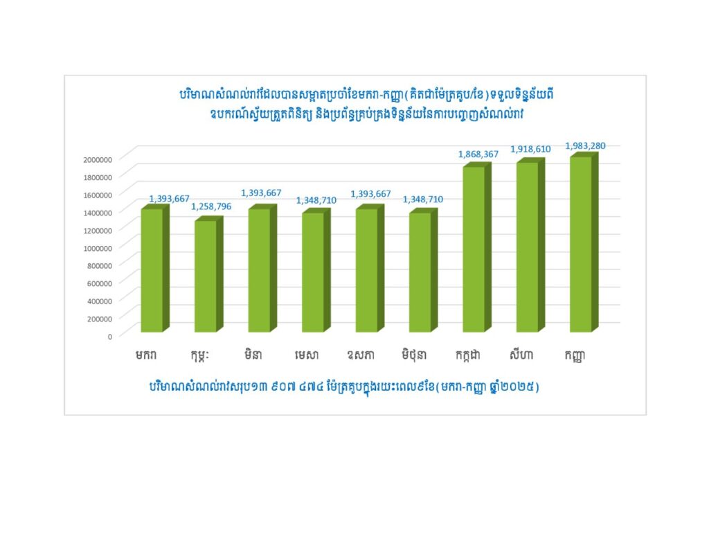 (ភ្នំពេញ)៖ ក្រសួងបរិស្ថានបានចាត់វិធានការទប់ស្កាត់ទឹកកខ្វក់បានចំនួន ១៣ ៧០៩ ៤៩៤ ម៉ែត្រគូប មិនឱ្យបំពុលតំបន់ទឹកសាធារណៈនៅកម្ពុជា គិតចាប់តាំងពីខែមករា ដល់ដំណាច់ខែកញ្ញា ឆ្នាំ២០២៥។ គ្រាន់តែក្នុងខែកញ្ញា ឆ្នាំ២០២៥ ទឹកកខ្វក់ចេញពីក្រុម និងរោងចក្រ ចំនួនជិត ២លានម៉ែត្រគូប ត្រូវបានទប់ស្កាត់មិនឱ្យបញ្ចេញទៅបំពុលប្រភពទឹកស្អាតនានានៅតាមរាជធានី-ខេត្ត។ អ្នកនាំបាក្យក្រសួងបរិស្ថាន ឯកឧត្តម ខ្វៃ អាទិត្យា បានឱ្យដឹងថា បានការអនុវត្តច្បាប់ទប់ស្កាត់ការបំពុលបរិស្ថាននេះ ត្រូវបានត្រួតពិនិត្យតាមដាន ឱ្យក្រុមហ៊ុន និងរោងចក្រ ដែលមានសក្តានុពលប្រភពបំពុល នៅតាមរាជធានី-ខេត្ត ត្រូវអនុវត្តឱ្យបានត្រឹមត្រូវតាមក្រមបរិស្ថាន និងធនធានធម្មជាតិ លើការបំពាក់ឧបករណ៍តាមដានស្វ័យត្រួតពិនិត្យ និងប្រព័ន្ធគ្រប់គ្រងទិន្នន័យការបញ្ចេញសំណល់រាវ នៅតាមទីតាំងរបស់ក្រុមហ៊ុន និងរោងចក្រទាំងអស់។ គិតត្រឹមថ្ងៃទី៣០ ខែកញ្ញា ឆ្នាំ២០២៥ ក្រុមហ៊ុន និងរោងចក្រ ចំនួន ៥៧ ទីតាំង បានចុះកិច្ចសន្យា ដើម្បីអនុវត្តច្បាប់ត្រឹមត្រូវ និងបានបំពាក់ឧបរណ៍ស្វ័យត្រួតពិនិត្យ ក្នុងនោះ មានក្រុមហ៊ុន និងសហគ្រាសចំនួន៤៦ បានបំពាក់រួចហើយ។