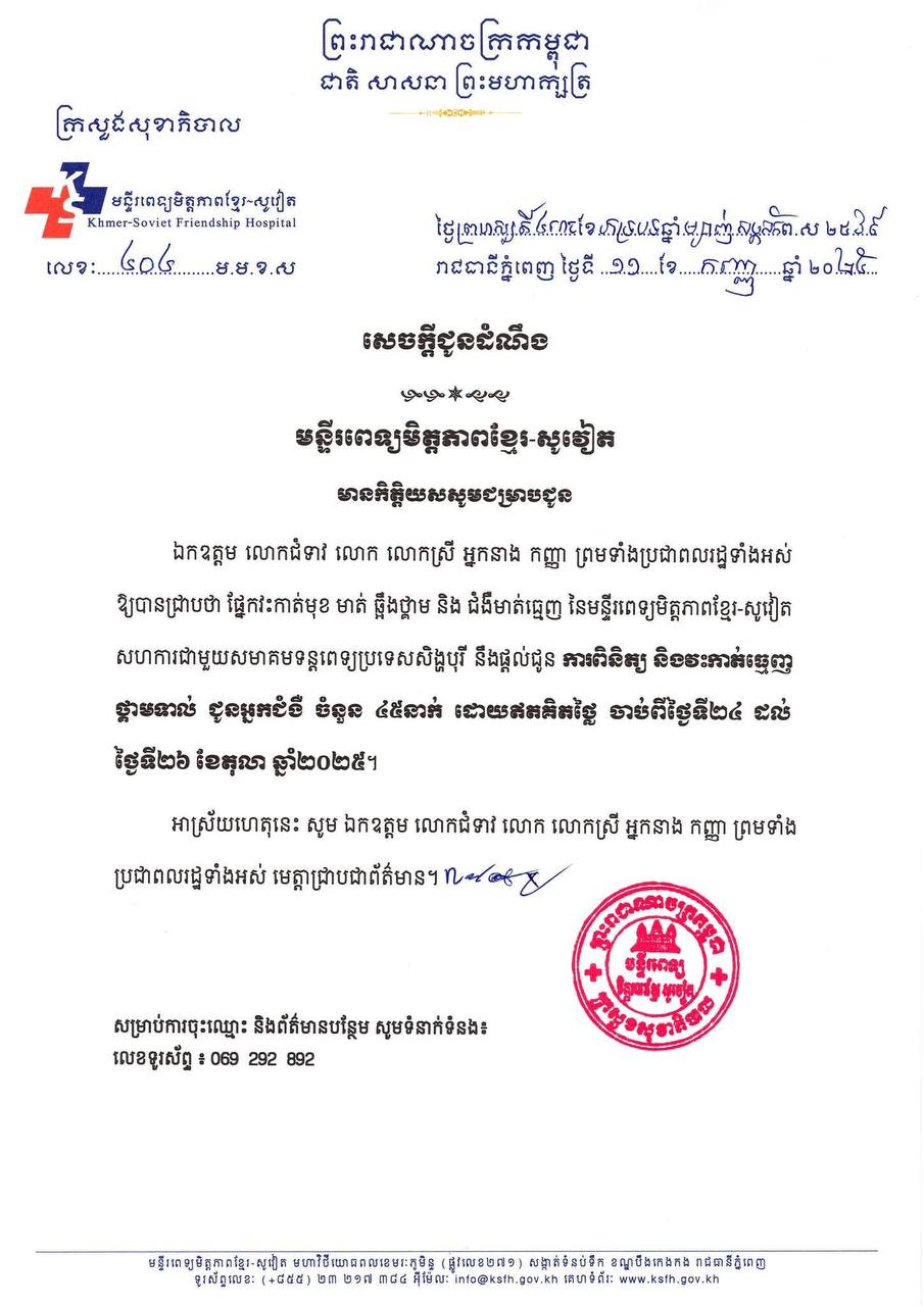 (ភ្នំពេញ)៖ មន្ទីរពេទ្យមិត្តភាពខ្មែរ-សូវៀត មានកិត្តិយសសូមជម្រាបជូនដំណឹងដល់ ប្រជាពលរដ្ឋទាំងអស់ ឱ្យបានជ្រាបថា ផ្នែកវះកាត់មុខ មាត់ ឆ្អឹងថ្គាម និង ជំងឺមាត់ធ្មេញ នៃមន្ទីរពេទ្យមិត្តភាពខ្មែរ-សូវៀត សហការជាមួយសមាគមទន្តពេទ្យប្រទេសសិង្ហបុរី នឹងផ្តល់ជូន ការពិនិត្យ និងវះកាត់ធ្មេញ ថ្គាមទាល់ ជូនអ្នកជំងឺ ចំនួន ៤៥នាក់ ដោយឥតគិតថ្លៃ ចាប់ពីថ្ងៃទី២៤ ដល់ ថ្ងៃទី២៦ ខែតុលា ឆ្នាំ២០២៥។