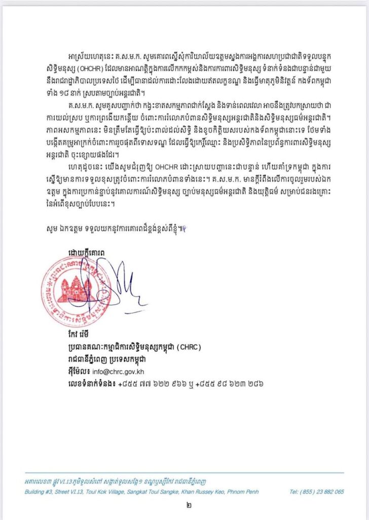គណៈកម្មាធិការសិទ្ធិមនុស្សកម្ពុជា បានលើកឡើងថា”ហេតុនេះ គ.ស.ម.ក. សូមគោរពស្នើសុំការិយាល័យឧត្តមស្នងការអង្គការសហប្រជាជាតិទទួលបន្ទុក សិទ្ធិមនុស្ស (OHCHR) ដែលមានអាណត្តិក្នុងការលើកកកម្ពស់និងការការពារសិទ្ធិមនុស្ស ទំនាក់ទំនងជាបន្ទាន់ជាមួយ នឹងរាជរាដ្ឋាភិបាលប្រទេសថៃ ដើម្បីធានាដល់ការដោះលែងដោយឥតលក្ខខណ្ឌ និងធ្វើមាតុភូមិនិវត្តន៍ កងទ័ពកម្ពុជា ទាំង ១៨ នាក់ ស្របតាមច្បាប់អន្តរជាតិ”។