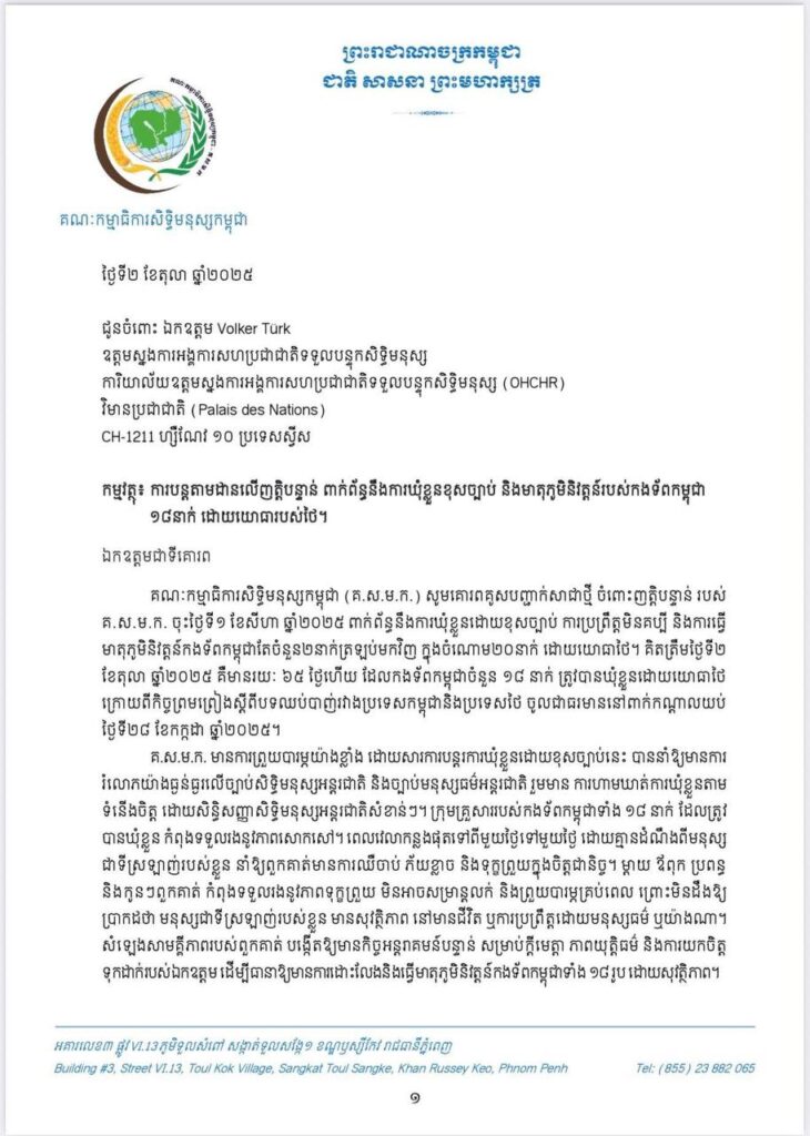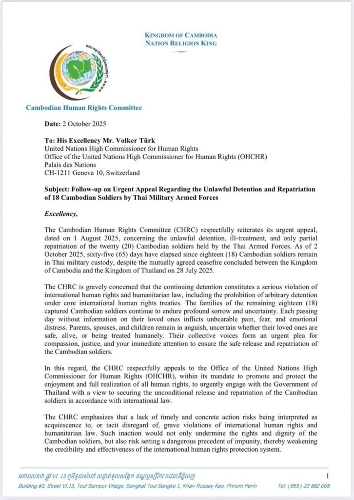 គណៈកម្មាធិការសិទ្ធិមនុស្សកម្ពុជា (គ.ស.ម.ក.) បានបញ្ជាក់ថាចំពោះញត្តិបន្ទាន់ របស់ គ.ស.ម.ក. ចុះថ្ងៃទី១ ខែសីហា ឆ្នាំ២០២៥ ពាក់ព័ន្ធនឹងការឃុំខ្លួនដោយខុសច្បាប់ ការប្រព្រឹត្តមិនគប្បី និងការធ្វើ មាតុភូមិនិវត្តន៍កងទ័ពកម្ពុជាតែចំនួន២នាក់ត្រឡប់មកវិញ ក្នុងចំណោម២០នាក់ ដោយយោធាថៃ។ គិតត្រឹមថ្ងៃទី២ ខែតុលា ឆ្នាំ២០២៥ គឺមានរយៈ ៦៥ ថ្ងៃហើយ ដែលកងទ័ពកម្ពុជាចំនួន ១៨ នាក់ ត្រូវបានឃុំខ្លួនដោយយោធាថៃ ក្រោយពីកិច្ចព្រមព្រៀងស្តីពីបទឈប់បាញ់រវាងប្រទេសកម្ពុជានិងប្រទេសថៃ ចូលជាធរមាននៅពាក់កណ្តាលយប់ ថ្ងៃទី២៨ ខែកក្កដា ឆ្នាំ២០២៥។