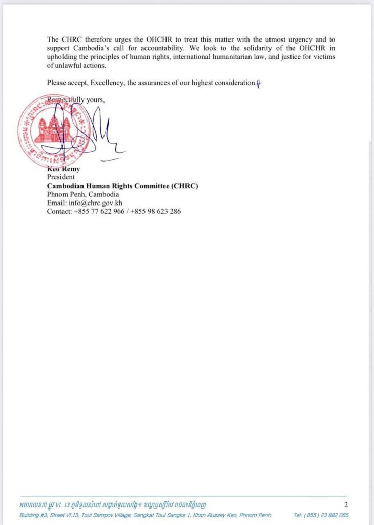 គណៈកម្មាធិការសិទ្ធិមនុស្សកម្ពុជា បានដាក់ញ្ញត្តិជំរុញជាលើកទី២ ទៅOHCHR នៅហ្សឺណែវ ដើម្បីឱ្យមានការដោះលែងកងទ័ពកម្ពុជាទាំង ១៨នាក់