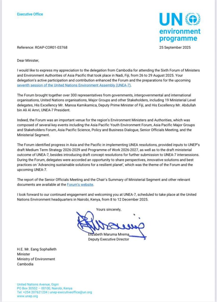 (ភ្នំពេញ)៖ កម្មវិធីបរិស្ថានសហប្រជាជាតិ បានវាយតម្លៃខ្ពស់ចំពោះការខិតខំប្រឹងប្រែងរបស់កម្ពុជា ជាពិសេសការចូលរួមជាមួយសហគមន៍អន្តរជាតិ ក្នុងកិច្ចខិតខំប្រឹងប្រែង និងការចូលរួមចែករំលែកបទពិសោធន៍ ដើម្បីដោះស្រាយបញ្ហាបរិស្ថាន។ លិខិតកម្មវិធីរបស់អង្គការសហប្រជាជាតិ ចុះថ្ងៃទី២៥ ខែកញ្ញា ឆ្នាំ២០២៥ បានថ្លែងកោតសរសើរចំពោះប្រតិភូកម្ពុជា ដែលបានចូលរួមយ៉ាងសកម្ម និងចែករំលែកបទពិសោធន៍ ដើម្បីដោះស្រាយបញ្ហាបរិស្ថាន ជាមួយបណ្តាប្រទេសនានា ក្នុងតំបន់និងពិភពលោក ក្នុងវេទិការដ្ឋមន្រ្តីបរិស្ថាន និងអាជ្ញាធរជាន់ខ្ពស់ ទទួលបន្ទុកបរិស្ថាននៃប្រទេសអាស៊ីប៉ាស៊ីហ្វិក លើកទី៦ នៅទីក្រុងណាឌី ប្រទែសហ្វីជី ចាប់ពីថ្ងៃទី២៦-២៩ ខែសីហា ឆ្នាំ២០២៥។ ជាមួយគ្នានេះ អង្គការសហប្រជាជាតិ និងបន្តធ្វើកិច្ចសហប្រតិបត្តិការបន្ថែមទៀត ជាមួយប្រទេសកម្ពុជាដើម្បីការអភិវឌ្ឍន៍ដោយចីរភាពសម្រាប់ប្រជាជាតិនៅក្នុងពិភពលោក និងបានអញ្ជើញកម្ពុជាចូលរួមមហាសន្និបាតស្តីពីបរិស្ថាន របស់អង្គការសហប្រជាជាតិលើកទី៧ ដែលគ្រោងរៀបចំឡើងចាប់ពីថ្ងៃទី៨-១២ ខែធ្នូ ឆ្នាំ២០២៥ ខាងមុខ នៅទីក្រុងណៃរ៉ូប៊ី ប្រទេសកេនយ៉ា។
