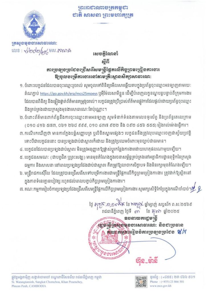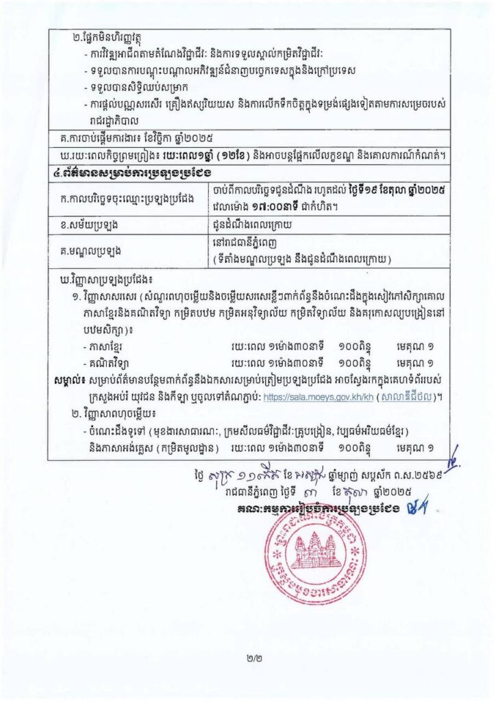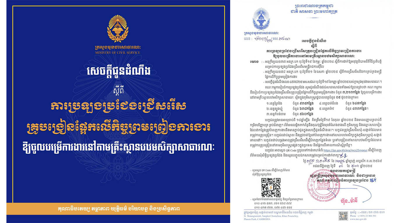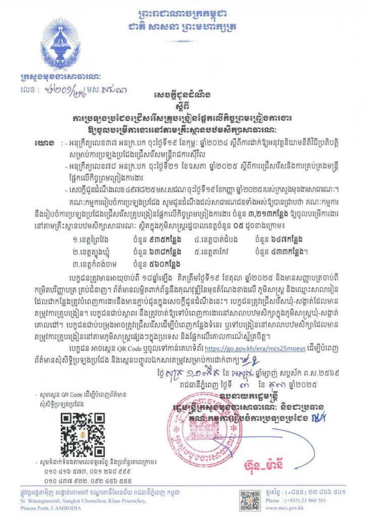 កាលបរិច្ឆេទចុះឈ្មោះប្រឡងប្រជែង និងការដាក់ពាក្យ៖ ចាប់ពីថ្ងៃជូនដំណឹង រហូតដល់ថ្ងៃទី១៩ ខែតុលា ឆ្នាំ២០២៥ វេលាម៉ោង ១៧:០០នាទី ជាកំហិត តាមរយៈ QR Code ឬចូលទៅកាន់តំណរភ្ជាប់ https://go.gov.kh/era/mcs25moeys