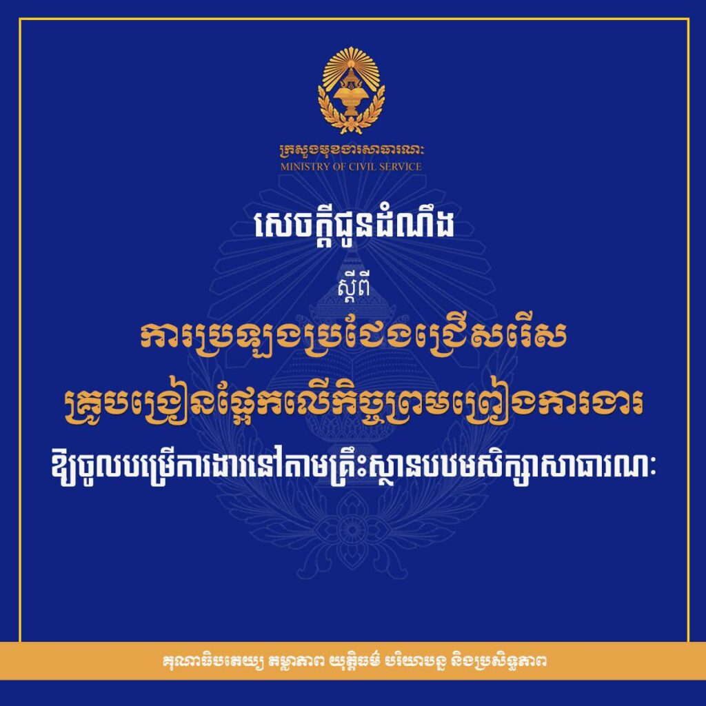 (ភ្នំពេញ)៖ គណៈកម្មការរៀបចំការប្រឡងប្រជែង សូមជូនដំណឹងដល់សាធារណជនទាំងអស់ឱ្យបានជ្រាបថា គណៈកម្មការនឹងរៀបចំការប្រឡងប្រជែងជ្រើសរើស «គ្រូបង្រៀនផ្អែកលើកិច្ចព្រមព្រៀងការងារ» ចំនួន ៣,២១៣កន្លែង ឱ្យចូលបម្រើការងារនៅតាមគ្រឹះស្ថានបឋមសិក្សាសាធារណៈ ស្ថិតក្នុងភូមិសាស្ត្ររដ្ឋបាលខេត្តព្រៃវែង ខេត្តត្បូងឃ្មុំ ខេត្តកំពង់ចាម ខេត្តបាត់ដំបង និងខេត្តតាកែវ។