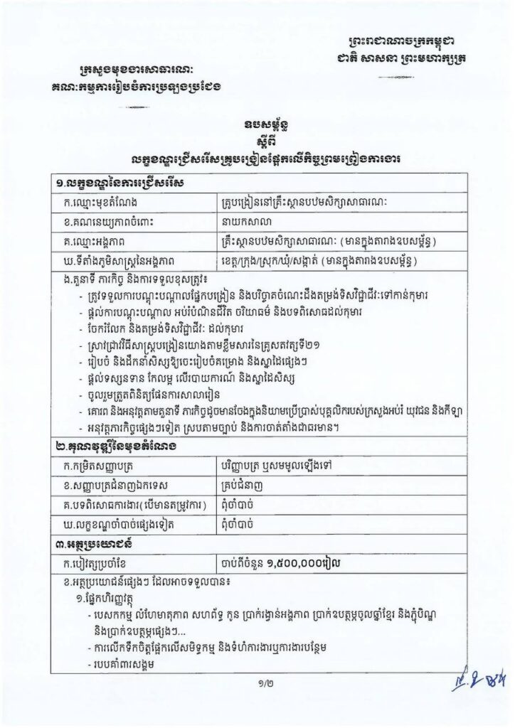 ចំពោះសាធារណជនដែលមានបំណងដាក់ពាក្យចូលរួមប្រឡងប្រជែង សូមអានសេចក្តីជូនដំណឹង សេចក្តីណែនាំ លក្ខខណ្ឌនៃការជ្រើសរើស និងតារាងឧបសម្ព័ន្ធស្តីពីលក្ខខណ្ឌជ្រើសរើសគ្រូបង្រៀនផ្អែកលើកិច្ចព្រមព្រៀងការងារ ឱ្យបានច្បាស់លាស់។
