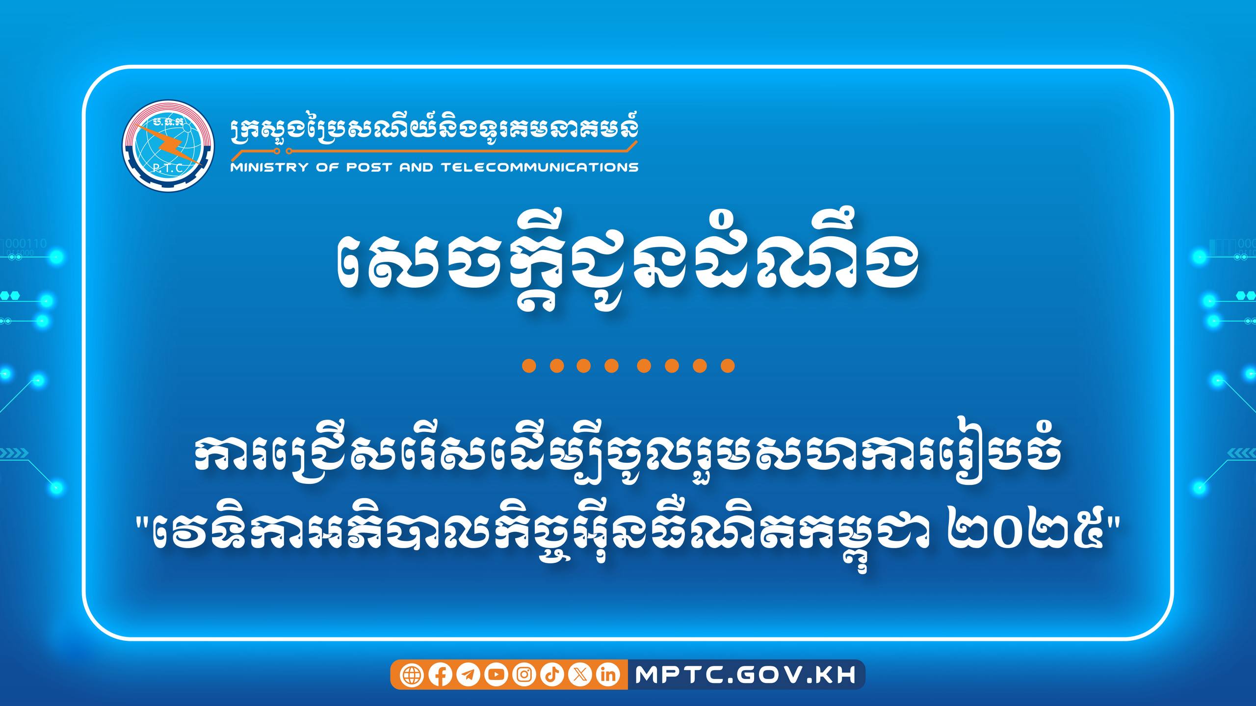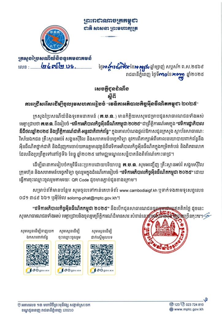 ក្រសួងប្រៃសណីយ៍ និងទូរគមនាគមន៍ ជូនដំណឹង ស្ដីពី ការជ្រើសរើសដើម្បីចូលរួមសហការរៀបចំ “វេទិកាអភិបាលកិច្ចអ៊ីនធឺណិតកម្ពុជា ២០២៥”