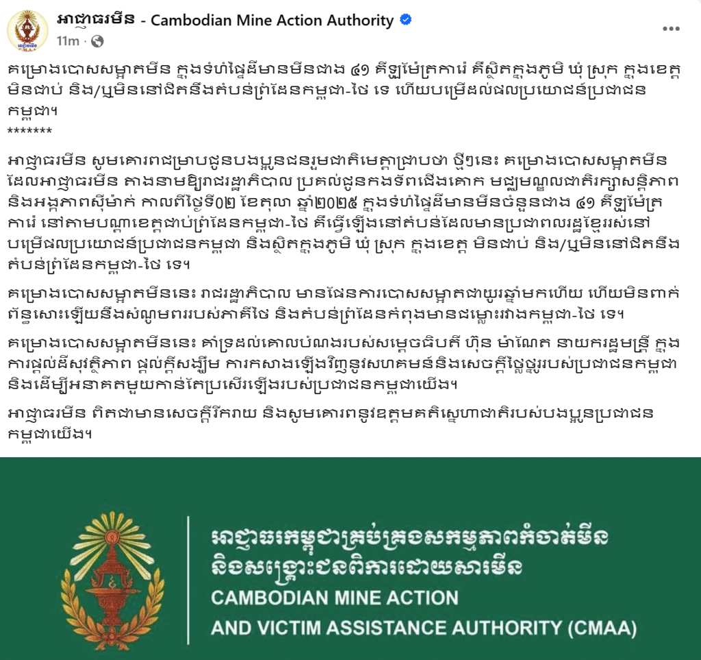 អាជ្ញាធរមីនបានបញ្ជាក់ថា ថ្មីៗនេះ គម្រោងបោសសម្អាតមីន ដែលអាជ្ញាធរមីន តាងនាមឱ្យរាជរដ្ឋាភិបាល ប្រគល់ជូនកងទ័ពជើងគោក មជ្ឈមណ្ឌលជាតិរក្សាសន្តិភាព និងអង្គភាពស៊ីម៉ាក់ កាលពីថ្ងៃទី២ ខែតុលា ឆ្នាំ២០២៥ ក្នុងទំហំផ្ទៃដីមានមីនចំនួនជាង៤១គីឡូម៉ែត្រការ៉េ នៅតាមបណ្តាខេត្តជាប់ព្រំដែនកម្ពុជា-ថៃ គឺធ្វើឡើងនៅតំបន់ដែលមានប្រជាពលរដ្ឋខ្មែររស់នៅ បម្រើផលប្រយោជន៍ប្រជាជនកម្ពុជា និងស្ថិតក្នុងភូមិ ឃុំ ស្រុក ក្នុងខេត្ត មិនជាប់ និង/ឬមិននៅជិតនឹងតំបន់ព្រំដែនកម្ពុជា-ថៃ ទេ។