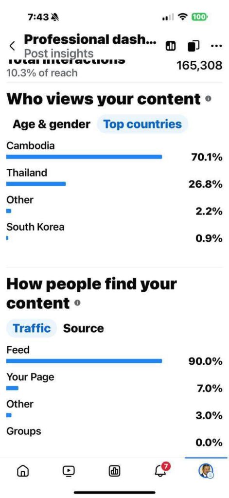 (ភ្នំពេញ)៖ សម្តេចតេជោ ហ៊ុន សែន ប្រមុខរដ្ឋស្ដីទី បានសរសេរលើបណ្ដាញសង្គមនៅយប់ថ្ងៃទី០៦ ខែតុលា ឆ្នាំ២០២៥ ថា ក្រោយការបង្ហោះសាររៀបរាប់អំពីទង្វើអសីលធម៌ អគុណធម៌ ដែលជាទង្វើអមនុស្ស និងអន់ជាងសត្វរបស់ជនជាតិថៃមួយចំនួន គិតត្រឹមម៉ោង ៧ និង ៤៥នាទីល្ងាចនេះ (រយៈពេល៧ម៉ោង) មានមនុស្សចូលមើលចំនួន 4,715,531នាក់ ចូលមើលដែលក្នុងនោះមានជនជាតិក្នុងប្រទេសថៃចំនួន 26.8% ប្រហាក់ប្រហែលជាង ១លាននាក់ បានចូលមើលដូចមានក្នុងតារាងជូនភ្ជាប់ ។