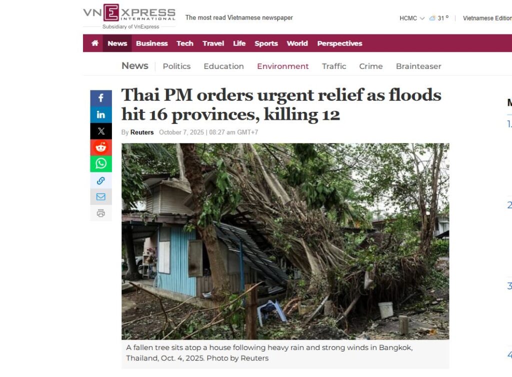 យោងតាមការចេញផ្សាយ របស់ទីភ្នាក់ងារព័ត៌មាន VNexpress នៅថ្ងៃអង្គារនេះ នាយករដ្ឋមន្ត្រីថៃ លោក Anutin Charnvirakul កាលពីថ្ងៃទី៦ ខែតុលា បានបញ្ជាឱ្យ មានកិច្ចខិតខំប្រឹងប្រែងសង្គ្រោះបន្ទាន់ បន្ទាប់ពីទឹកជំនន់ ដែលបង្កឡើងដោយភ្លៀងធ្លាក់ខ្លាំង ជាច្រើនថ្ងៃ និងព្យុះ បានវាយប្រហារខេត្តចំនួន ១៦ ក្នុងរយៈពេលមួយសប្តាហ៍ កន្លងមកនេះ ដោយបានសម្លាប់មនុស្ស ១២នាក់ និង ប៉ះពាល់ដល់ ជាង១០ម៉ឺនគ្រួសារ។