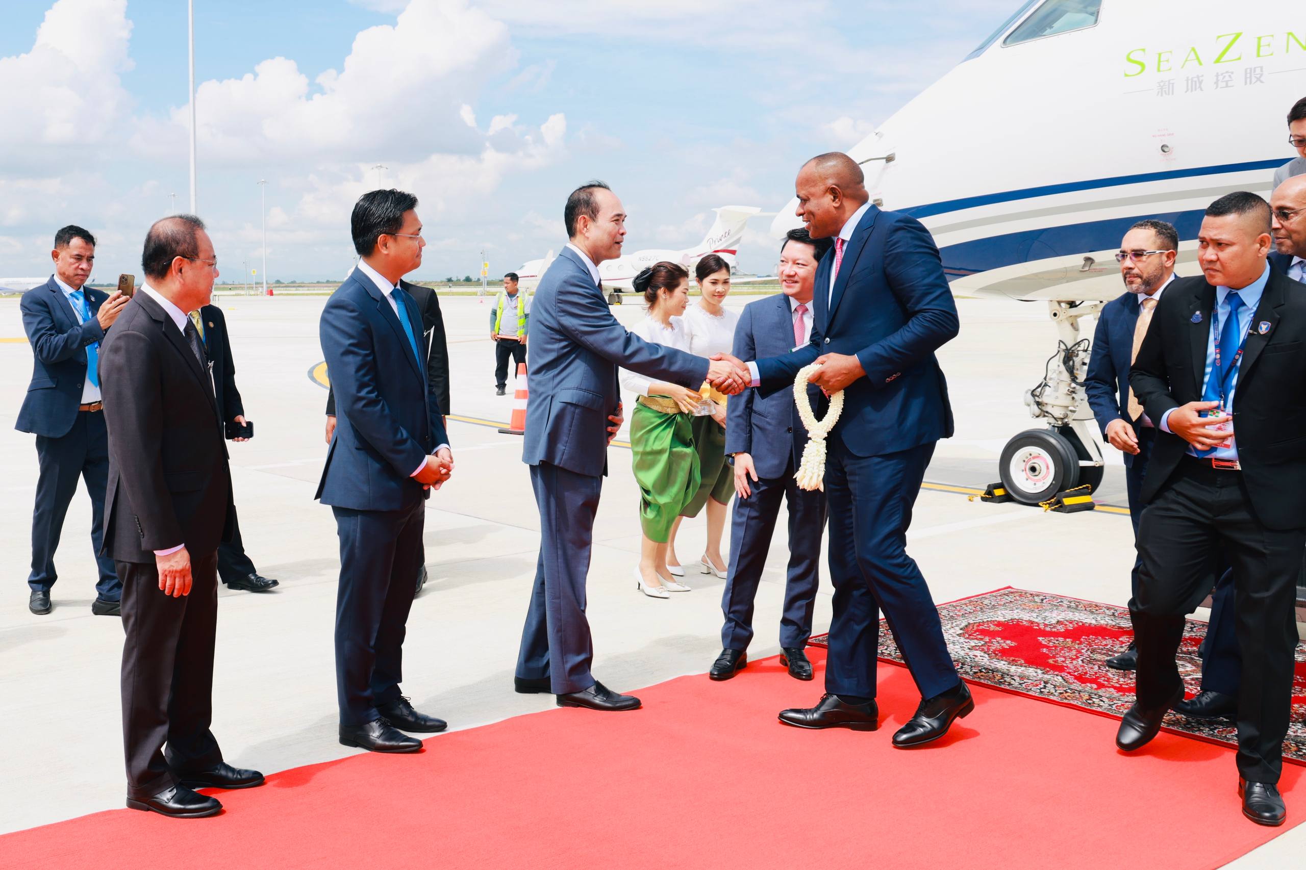 (កណ្តាល)៖ ឯកឧត្តម Roosevelt Skerrit នាយករដ្ឋមន្ត្រីនៃកុំមិនវែលដូមីនីកា អញ្ជើញមកដល់អាកាសយានដ្ឋានអន្តរជាតិតេជោ នៅក្រុងតាខ្មៅ ខេត្តកណ្តាល នាព្រឹកថ្ងៃទី០៨ ខែតុលា ឆ្នាំ២០២៥ ដើម្បីបំពេញទស្សនកិច្ចការងារ រយៈពេល៣ថ្ងៃ នៅព្រះរាជាណាចក្រកម្ពុជា ។ ដំណើរអញ្ជើញអាកាសយានដ្ឋានអន្តរជាតិតេជោ នៅក្រុងតាខ្មៅ ខេត្តកណ្តាល របស់ឯកឧត្តម នាយករដ្ឋមន្ត្រីនៃកុំមិនវែលដូមីនីកា មានការទទួលស្វាគមន៍ពីឯកឧត្តម សុខ សូកេន រដ្ឋមន្ត្រីក្រសួងអធិការកិច្ច មន្ត្រីក្រសួងការបរទេសកម្ពុជា និងមន្ត្រីនៃរាជរដ្ឋាភិបាលកម្ពុជាផ្សេងទៀត ។