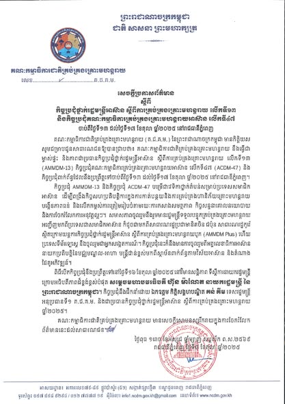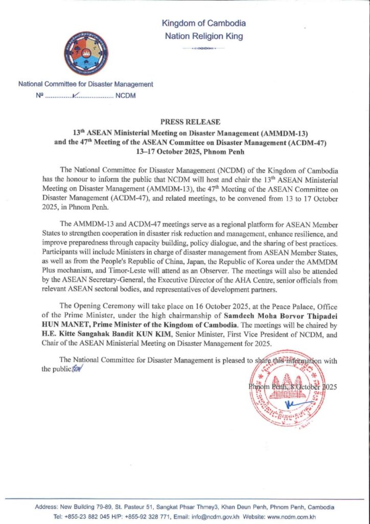 (ភ្នំពេញ)៖ គណៈកម្មាធិការជាតិគ្រប់គ្រងគ្រោះមហន្តរាយនៃព្រះរាជាណាចក្រកម្ពុជា នឹងធ្វើជាម្ចាស់ផ្ទះ និងភាពជាប្រធានកិច្ចប្រជុំថ្នាក់រដ្ឋមន្ត្រីអាស៊ាន ស្តីពីការគ្រប់គ្រងគ្រោះមហន្តរាយ លើកទី១៣ (AMMDM-13) និងកិច្ចប្រជុំគណៈកម្មាធិការគ្រប់គ្រងគ្រោះមហន្តរាយអាស៊ានលើកទី៤៧ (ACDM-47) និងកិច្ចប្រជុំពាក់ពន្ធ ដែលនឹងប្រព្រឹត្តទៅចាប់ពីថ្ងៃទី១៣ ដល់ថ្ងៃទី១៧ ខែតុលា ឆ្នាំ២០២៥ នៅរាជធានីភ្នំពេញ។
