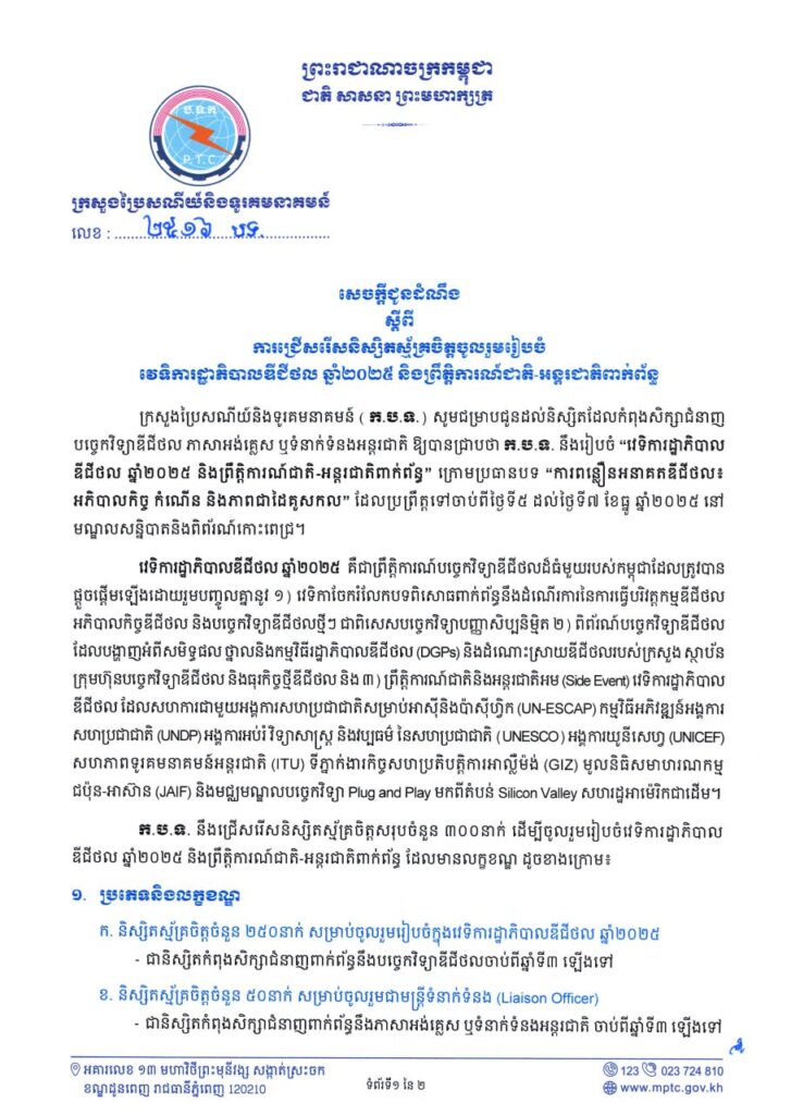 ក្រសួងប្រៃសណីយ៍ប្រកាស ជ្រើសរើសនិស្សិតស្ម័គ្រចិត្តសរុបចំនួន ៣០០នាក់ ចូលរួមរៀបចំវេទិការដ្ឋាភិបាលឌីជីថល ឆ្នាំ២០២៥ និងព្រឹត្តិការណ៍ជាតិ-អន្តរជាតិពាក់ព័ន្ធ