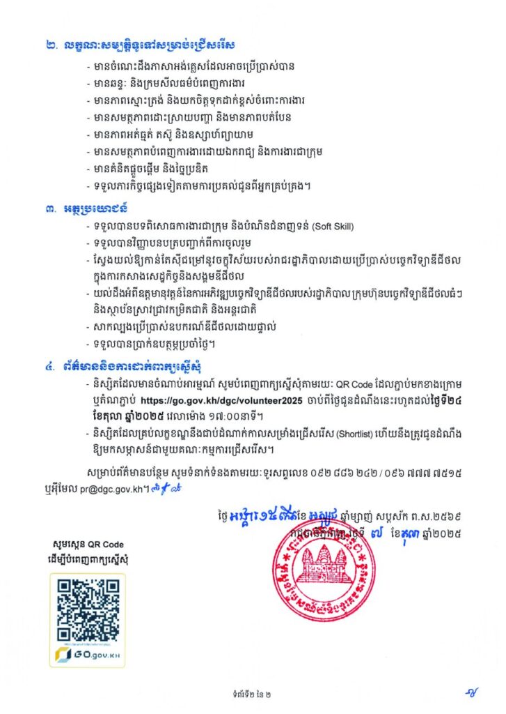 - និស្សិតដែលមានចំណាប់អារម្មណ៍ សូមបំពេញពាក្យស្នើសុំតាមរយៈ QR Code ដែលភ្ជាប់មកខាងក្រោម ឬតំណភ្ជាប់ https://go.gov.kh/dgc/volunteer2025 ចាប់ពីថ្ងៃជូនដំណឹងនេះរហូតដល់ថ្ងៃទី២៤ ខែតុលា ឆ្នាំ២០២៥ វេលាម៉ោង ១៧:០០នាទី។