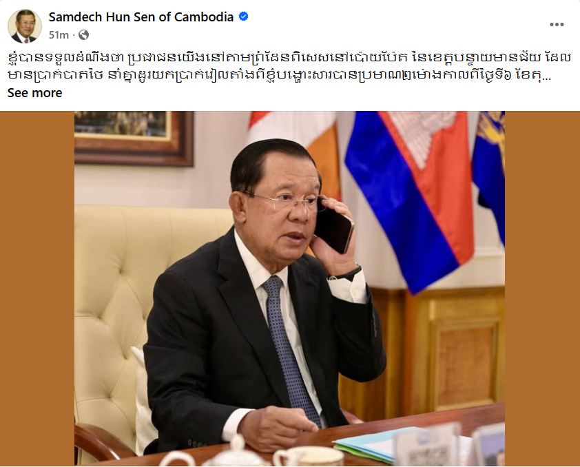 ភ្នំពេញ៖ បើយោងតាមគេហទំព័រផ្លូវការរបស់សម្តេចតេជោ ហ៊ុន សែន ប្រធានព្រឹទ្ធសភា នៃព្រះរាជាណាចក្រកម្ពុជា បានសរសេរលើបណ្តាញសង្គមថា៖ សម្តេចបានទទួលដំណឹងថា ប្រជាជនយើងនៅតាមព្រំដែនពិសេសនៅប៉ោយប៉ែត នៃខេត្តបន្ទាយមានជ័យ ដែលមានប្រាក់បាតថៃ នាំគ្នាដូរយកប្រាក់រៀលតាំងពីសម្តេចបង្ហោះសារបានប្រមាណ២ម៉ោងកាលពីថ្ងៃទី៦ ខែតុលា ឆ្នាំ២០២៥។