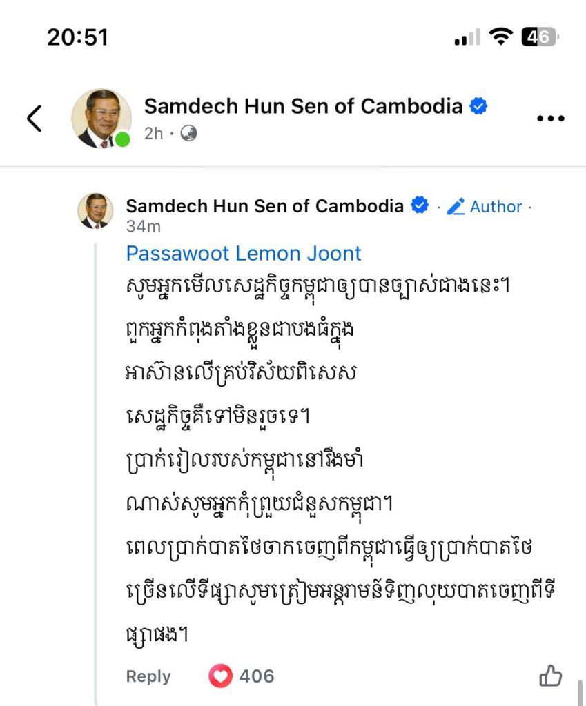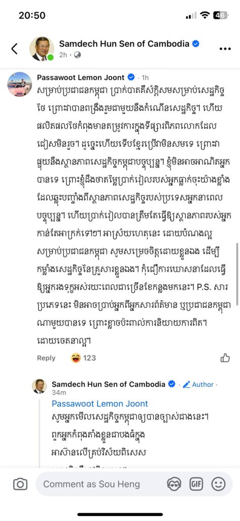 (ភ្នំពេញ)៖ សម្តេចតេជោ ហ៊ុន សែន នៅយប់ថ្ងៃទី០៨ ខែតុលា ឆ្នាំ២០២៥ បានឆ្លើយតបទៅខមមិនរបស់ជនជាតិថៃ ដែលមានឈ្មោះ Passawoot Lemon Joont ថា៖
