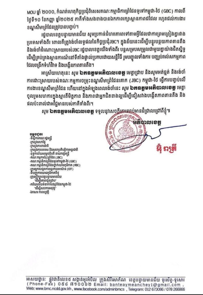 អភិបាលខេត្តបន្ទាយមានជ័យបានលើកឡើងដែរថា៖”រដ្ឋបាលខេត្តបន្ទាយមានជ័យសូមបញ្ជាក់ជាថ្មីថា រដ្ឋបាលខេត្តយើងទាំងពីរមិនមាន សមត្ថកិច្ចកំណត់ព្រំដែនក្នុងតំបន់មិនទាន់មានការខណ្ឌសីមាព្រំដែនរួចរាល់នោះទេ។ យោងតាមMOU ឆ្នាំ ២០០០, កំណត់ហេតុកិច្ចប្រជុំពិសេសគណៈកម្មាធិការព្រំដែនទូទៅកម្ពុជា-ថៃ (GBC) កាលពី ថ្ងៃទី១០ ខែកញ្ញា ឆ្នាំ២០២៥ ភាគីទាំងសងខាងបានឯកភាពរក្សាស្ថានភាពដដែល រហូតដល់ការងារ ខណ្ឌសីមាព្រំដែនត្រូវបានបញ្ចប់”។
