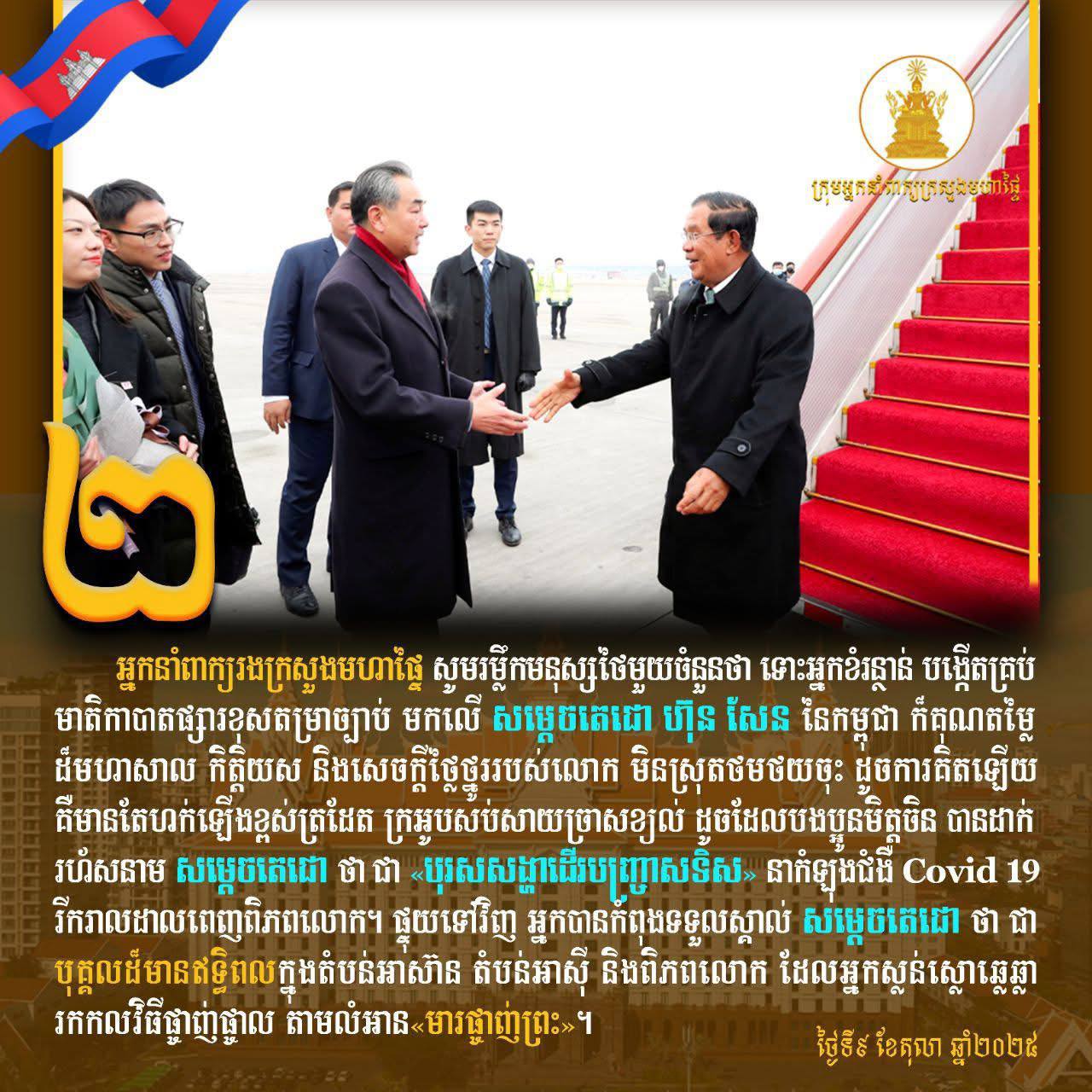ក្នុងការឆ្លើយតបទៅនឹងការប្រព្រឹត្តិមិនគប្បី របស់ជនជាតិថៃមួយចំនួនមកលើថ្នាក់ដឹកនាំកំពូលរបស់កម្ពុជានេះដែរ អ្នកនាំពាក្យរងក្រសួងមហាផ្ទៃបានបញ្ជាក់ដែរថា៖ការធ្វើបែបនេះរបស់ពួកគេគឺមានតែហក់ឡើងខ្ពស់ត្រដែត ក្រអូបសប់សាយច្រាសខ្យល់ ដូចដែលបងប្អូនមិត្តចិន បានដាក់រហ័សនាម សម្ដេចតេជោ ថាជា «បុរសសង្ហាដើរបញ្ច្រាសទិស» នាកំឡុងជំងឺ Covid 19 រីករាលដាលពេញពិភពលោក។