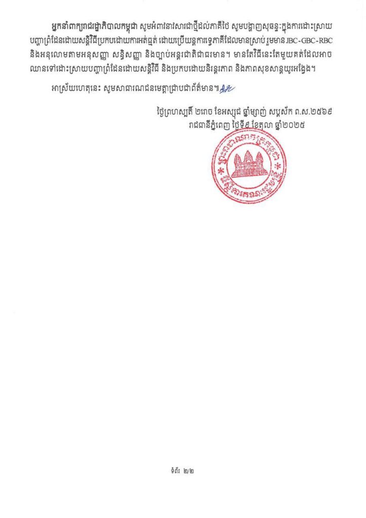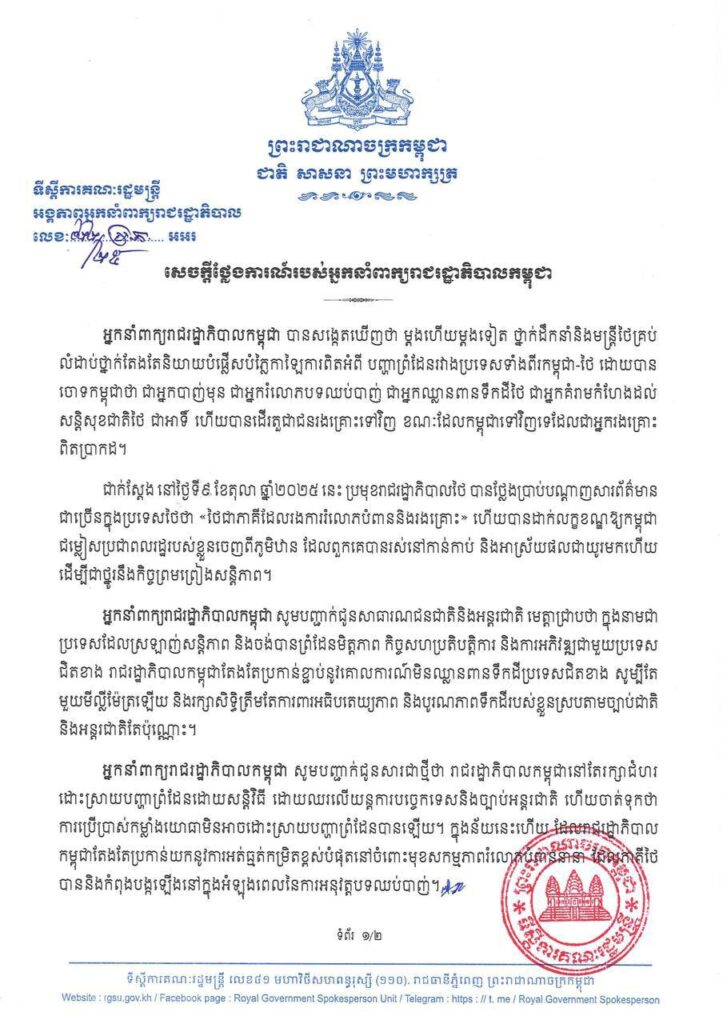 អ្នកនាំពាក្យរាជរដ្ឋាភិបាលកម្ពុជា សូមបញ្ជាក់ជូនសារជាថ្មីថារាជរដ្ឋាភិបាលកម្ពុជានៅតែរក្សាជំហរដោះស្រាយបញ្ហាព្រំដែនដោយសន្តិវិធីដោយឈរលើយន្តការបច្ចេកទេសនិងច្បាប់អន្តរជាតិ ហើយចាត់ទុកថាការប្រើប្រាស់កម្លាំងយោធាមិនអាចដោះស្រាយបញ្ហាព្រំដែនបានឡើយ។ ក្នុងន័យនេះហើយ ដែលរាជរដ្ឋាភិបាលកម្ពុជាតែងតែប្រកាន់យកនូវការអត់ធ្មត់កម្រិតខ្ពស់បំផុតនៅចំពោះមុខសកម្មភាពរំលោភបំពាននានា ដែលភាគីថៃបាននិងកំពុងបង្កឡើងនៅក្នុងអំឡុងពេលនៃការអនុវត្តបទឈប់បាញ់។