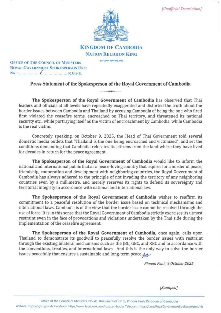 The Spokesperson of the Royal Government of Cambodia wishes to reaffirm its commitment to a peaceful resolution of the border issue based on technical mechanisms and international laws. Cambodia is of the view that the border issue cannot be resolved through the use of force. It is in this sense that the Royal Government of Cambodia strictly exercises its utmost restraint even in the face of provocations and violations undertaken by the Thai side during the implementation of the ceasefire agreement.