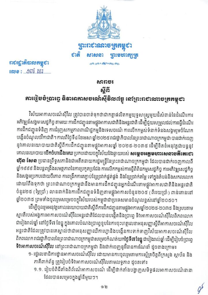រាជរដ្ឋាភិបាល ចេញសារាចរ ស្តីពី ការរៀបចំប្រារព្ធ ទិវាអាកាសចរណ៍ស៊ីវិល៧ធ្នូ នៅ កម្ពុជា