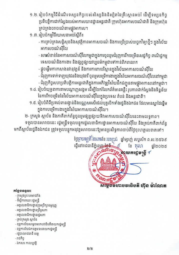 (ភ្នំពេញ)៖ រាជរដ្ឋាភិបាលកម្ពុជា បានចេញសារាចរ ស្តីពី ការរៀបចំប្រារព្ធ ទិវាអាកាសចរណ៍ស៊ីវិល៧ធ្នូ នៅព្រះរាជាណាចក្រកម្ពុជា ។ នេះបើតាមសារាចរដែលចុះហត្ថលេខាដោយសម្ដេចនាយករដ្ឋមន្ត្រី ហ៊ុន ម៉ាណែត នៅថ្ងៃទី០៩ ខែតុលា ឆ្នាំ២០២៥ ។