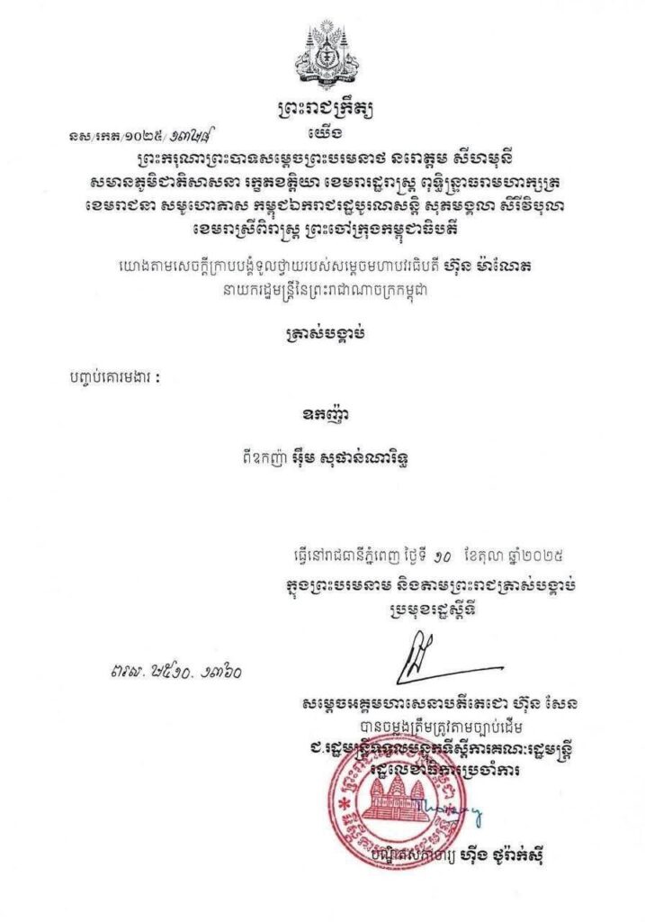 (ភ្នំពេញ)៖ ប្រមុខរដ្ឋស្ដីទី សម្តេចតេជោ ហ៊ុន សែន បានបញ្ចប់គោរមងារ ឧកញ៉ា ពី ឧកញ៉ា អ៊ឹម សុផាន់ណារិទ្ធ ម្ចាស់ចែកចាយនូវសាច់ជាច្រើនប្រភេទ ។ ការបញ្ចប់គោរមងារនេះ បានធ្វើឡើងក្នុងព្រះរាជក្រឹត្យ លេខ នស/រកត/១០២៥/១៣២៨ ដោយយោងតាមសេចក្តីក្រាបបង្គំទូលថ្វាយរបស់សម្តេចមហាបវរធិបតី ហ៊ុន ម៉ាណែត នាយករដ្ឋមន្រ្តី នៃព្រះរាជាណាចក្រកម្ពុជា ។