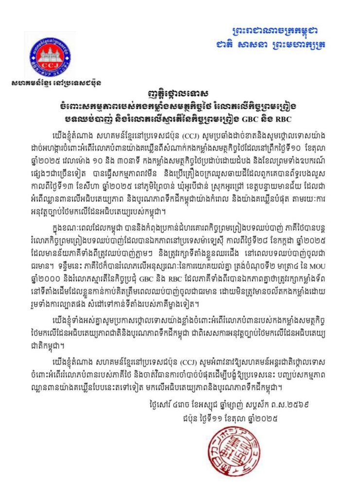 (ភ្នំពេញ)៖ សមាគមខ្មែរដែលមានមូលដ្ឋាននៅប្រទេសជប៉ុន នៅថ្ងៃទី១១ ខែតុលា ឆ្នាំ២០២៥នេះ បានចេញញត្តិថ្កោលទោសចំពោះសកម្មភាពរបស់កងកម្លាំងសមត្ថកិច្ចថៃ ដែលបានរំលោភលើកិច្ចព្រមព្រៀងបទឈប់បាញ់ និងរំលោភលើស្មារតីនៃកិច្ចព្រមព្រៀម GBC និង RBC។