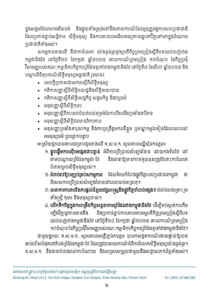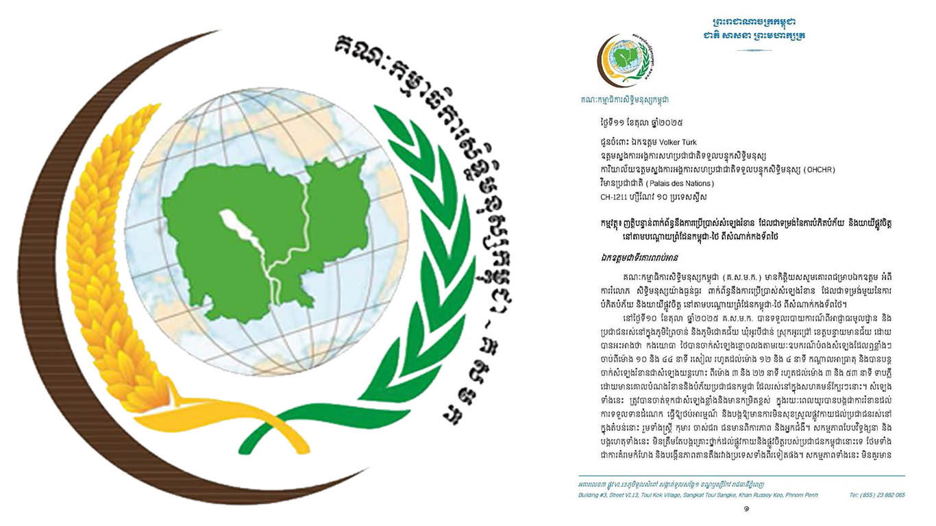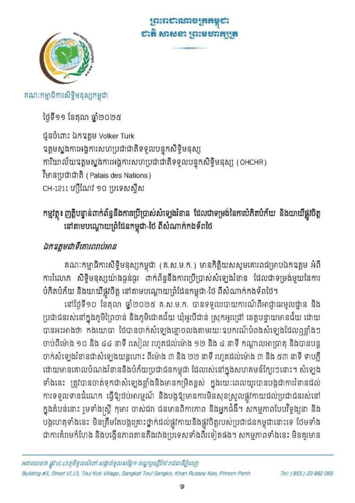 គណៈកម្មាធិការសិទ្ធិមនុស្សកម្ពុជា ផ្ញើញត្តិបន្ទាន់ជូន ឧត្តមស្នងការអង្គការសហប្រជាជាតិទទួលបន្ទុកសិទ្ធិមនុស្ស បន្ទាប់ពីថៃប្រើប្រាស់សំឡេងរំខាន និងបំភិតបំភ័យ ពលរដ្ឋកម្ពុជានៅតាមព្រំដែន