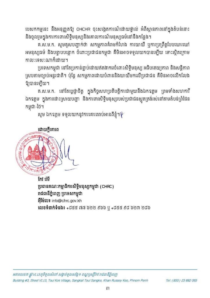 ជាមួយគ្នានេះគណៈកម្មាធិការសិទ្ធិមនុស្សកម្ពុជា(OHCHR) បានអញ្ជើញឧត្តមស្នងការអង្គការសហប្រជាជាតិទទួលបន្ទុកសិទ្ធិមនុស្ស (OHCHR)ចុះមកសង្កេតការណ៍ដោយផ្ទាល់ឱ្យបាន ឆាប់រហ័សបំផុតនៅតំបន់ព្រំដែនកម្ពុជា-ថៃ ដែលត្រូវបានរាយការណ៍អំពីការរំលោភសិទ្ធិមនុស្សយ៉ាងធ្ងន់ធ្ងរ។ ហើយក៏បានធានារ៉ាប់រងរាល់ការចំណាយ និងសម្របសម្រួលជាមួយនឹងអាជ្ញាធរពាក់ព័ន្ធទាំងអស់ ។