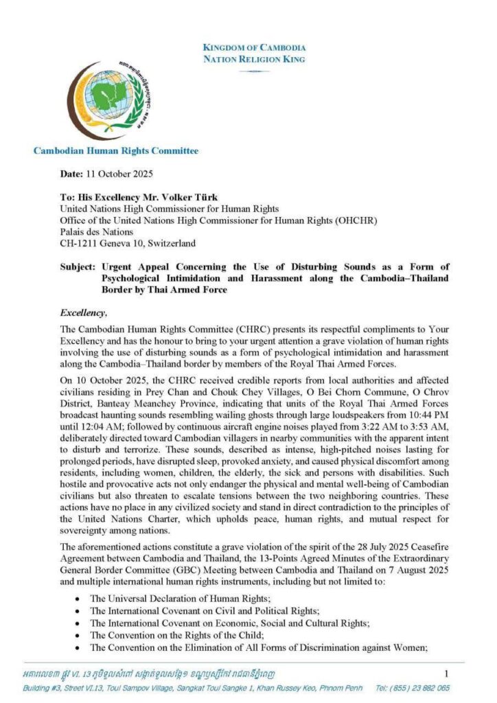(ភ្នំពេញ)៖ ដោយសារភាពគឃ្លើន និង ការប្រព្រឹត្តិមិនខ្លាចច្បាប់អន្តរជាតិពីសំណាក់កងទ័ពថៃនោះ គណៈកម្មាធិការសិទ្ធិមនុស្សកម្ពុជាបានផ្ញើញត្តិបន្ទាន់ជូន ឯកឧត្តម Volker Türk ឧត្តមស្នងការអង្គការសហប្រជាជាតិទទួលបន្ទុកសិទ្ធិមនុស្ស (OHCHR) ពាក់ព័ន្ធនឹងការប្រើប្រាស់សំឡេងរំខាន ដែលជាទម្រង់នៃការបំភិតបំភ័យ និងយាយីផ្លូវចិត្ត នៅតាមបណ្តោយព្រំដែនកម្ពុជា-ថៃ ។