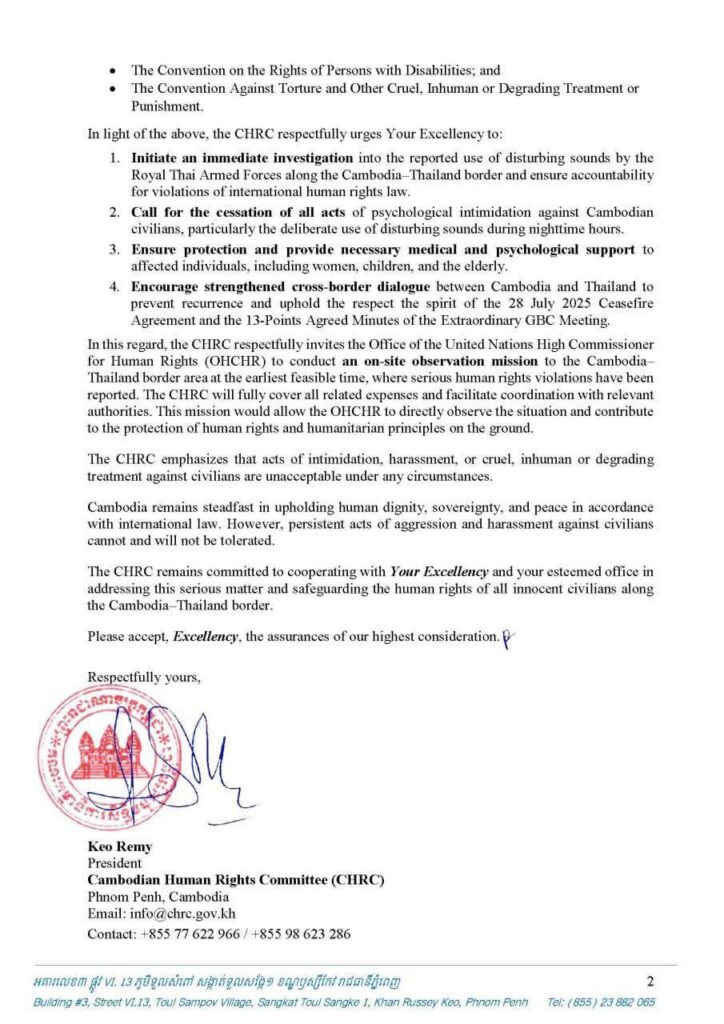 គណៈកម្មាធិការសិទ្ធិមនុស្សកម្ពុជាបានស្នើសុំ ដល់ឯកឧត្តម Volker Türk ឧត្តមស្នងការអង្គការសហប្រជាជាតិទទួលបន្ទុកសិទ្ធិមនុស្ស (OHCHR) មួយចំនួនដូចជា ៖ ១. ផ្តួចផ្តើមការស៊ើបអង្កេតជាបន្ទាន់ អំពីការប្រើប្រាស់សំឡេងរំខាន ដោយកងទ័ពថៃ នៅតាមបណ្តោយព្រំដែនកម្ពុជា-ថៃនិងធានាឱ្យមានការទទួលខុសត្រូវចំពោះការរំលោភ បំពានច្បាប់សិទ្ធិមនុស្សនេះ។ ២. អំពាវនាវឱ្យបញ្ឈប់គ្រប់សកម្មភាព ដែលគំរាមកំហែងផ្លូវចិត្តរបស់ប្រជាជនកម្ពុជា ជា ពិសេសការប្រើប្រាស់សំឡេងរំខាននៅពេលយប់អាធ្រាតុ។ ៣. ធានាការការពារនិងការផ្តល់ជំនួយវេជ្ជសាស្ត្រនិងផ្លូវចិត្តចាំបាច់ផ្សេងៗ ដល់ជនរងគ្រោះ រួម ទាំងស្ត្រី កុមារ និងមនុស្សចាស់។ ៤. លើកទឹកចិត្តក្នុងការពង្រឹងកិច្ចសន្ទនាតាមព្រំដែនរវាងកម្ពុជានិងថៃ ដើម្បីទប់ស្កាត់ការកើត ឡើងវិញនូវភាពតានតឹង និងប្រកាន់ខ្ជាប់ការគោរពតាមស្មារតីកិច្ចព្រមព្រៀងស្តីពីបទ ឈប់បាញ់រវាងកម្ពុជានិងថៃ នៅថ្ងៃទី២៨ ខែកក្កដា ឆ្នាំ២០២៥ គោលការណ៍ព្រមព្រៀង ១៣ចំណុច នៃកិច្ចប្រជុំវិសាមញ្ញរបស់គណៈកម្មាធិការកិច្ចការព្រំដែនទូទៅរវាងកម្ពុជានិងថៃ។
