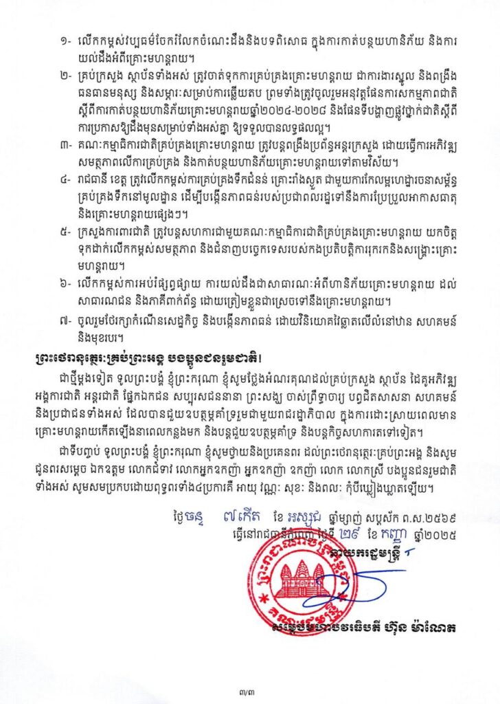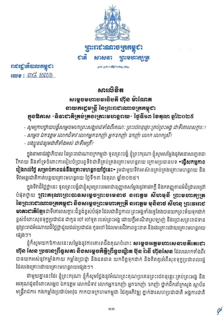 (ភ្នំពេញ)៖ យោងតាមសារលិខិត «ទិវាជាតិគ្រប់គ្រងគ្រោះមហន្តរាយ» នៅថ្ងៃទី១៣ ខែតុលា ឆ្នាំ២០២៥ សម្តេចមហាបវរធិបតី ហ៊ុន ម៉ាណែត នាយករដ្ឋមន្ត្រី កម្ពុជា បានថ្លែងថា រាជរដ្ឋាភិបាលកម្ពុជា សូមគាំទ្រ ចំពោះការរៀបចំប្រារព្ធទិវាជាតិគ្រប់គ្រងគ្រោះមហន្តរាយ ក្រោមប្រធានបទ (ធ្វើសកម្មភាពរៀងរាល់ថ្ងៃ សម្រាប់ភាពធន់នឹងគ្រោះមហន្តរាយថ្ងៃនេះ) រួមជាមួយទិវាអាស៊ានគ្រប់គ្រងគ្រោះមហន្តរាយ និងទិវាអន្តរជាតិ កាត់បន្ថយគ្រោះមហន្តរាយ នៅថ្ងៃទី១៣ ខែតុលា ឆ្នាំ២០២៥។