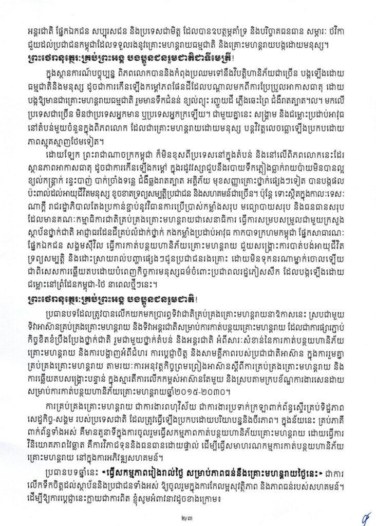 ប៉ុន្តែទោះស្ថិតក្នុងកាលៈទេសៈណាក្តី រាជរដ្ឋាភិបាលតែងប្រកាន់ខ្ជាប់នូវវិធានការប្រើប្រាស់កម្លាំងសរុប មធ្យោបាយសរុប និងធនធានសរុបដែលមានគណៈកម្មាធិការជាតិគ្រប់គ្រង គ្រោះមហន្តរាយជាសេនាធិការ ធ្វើការសម្របសម្រួលជាមួយក្រសួង ស្ថាប័នថ្នាក់ជាតិ អាជ្ញាធរដែនដីគ្រប់លំដាក់ថ្នាក់ កងកម្លាំងប្រដាប់អាវុធ កាកបាទក្រហមកម្ពុជា ផ្នែកសាធារណៈ ផ្នែកឯកជន សង្គមស៊ីវិល ធ្វើការកាត់បន្ថយហានិភ័យគ្រោះមហន្តរាយ ជួយសង្គ្រោះការបាត់បង់អាយុជីវិត ទ្រព្យសម្បត្តិ និងដោះស្រាយរាល់បញ្ហាផ្សេងៗ ជូនប្រជាជនរងគ្រោះ ដោយមិនទុកនរណាម្នាក់ចោលឡើយ ជាពិសេសការឆ្លើយតបដោយបំពេញកិច្ចការមនុស្សធម៌ ចំពោះប្រជាពលរដ្ឋភៀសសឹក ដែលបង្កឡើងដោយជម្លោះនៅព្រំដែនកម្ពុជា-ថៃ នាពេលថ្មីៗនេះ។