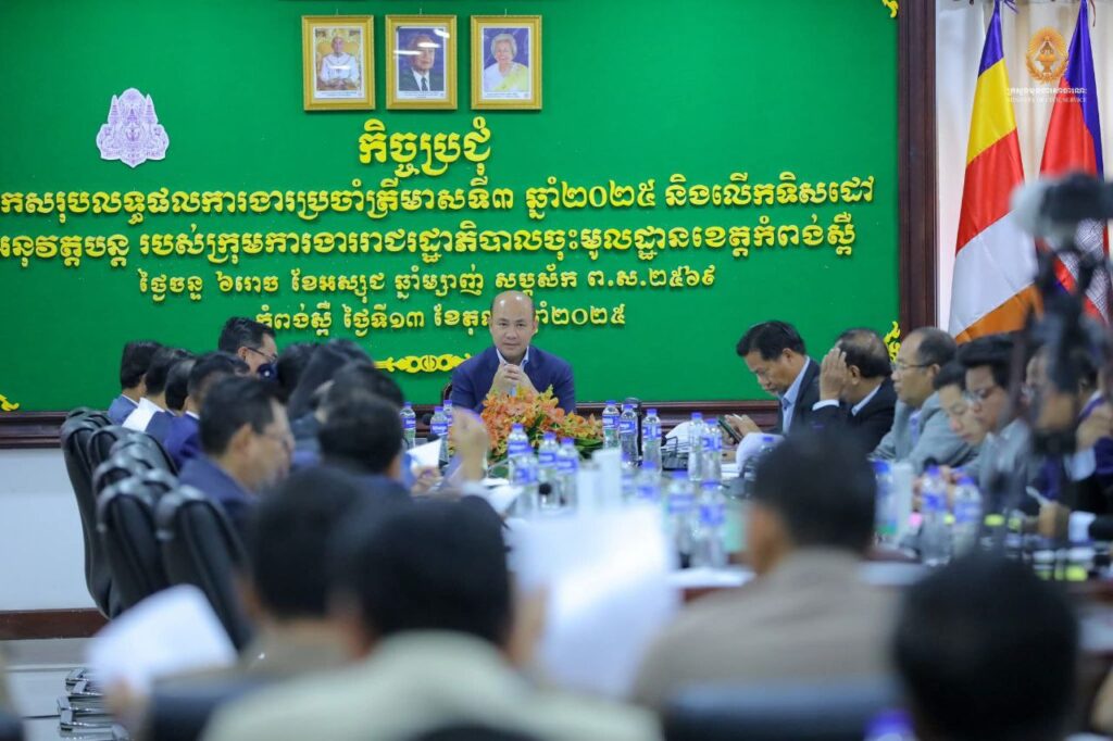 ប្រសាសន៍លើកឡើងរបស់ ឯកឧត្ដម ហ៊ុន ម៉ានី ឧបនាយករដ្ឋមន្ត្រី រដ្ឋមន្ត្រីក្រសួងមុខងារសាធារណៈ និងជាប្រធានក្រុមការរាជរដ្ឋាភិបាលចុះមូលដ្ឋានខេត្តកំពង់ស្ពឺ បានដឹកនាំកិច្ចប្រជុំបូកសរុបលទ្ធផលការងារប្រចាំត្រីមាសទី៣ ឆ្នាំ២០២៥ និងលើកទិសដៅអនុវត្តបន្ត។ កិច្ចប្រជុំនេះបានប្រព្រឹត្តទៅនារសៀលថ្ងៃទី១៣ ខែតុលា ឆ្នាំ២០២៥ នៅសាលាខេត្តកំពង់ស្ពឺ ដោយមានការអញ្ជើញចូលរួមពី ប្រធាន អនុប្រធាន សមាជិក សមាជិកាក្រុមការងារចុះមូលដ្ឋានខេត្ត ក្រុង ស្រុក ថ្នាក់ដឹកនាំរដ្ឋបាលខេត្ត ក្រុង ស្រុក និងមន្ទីរ អង្គភាពជុំវិញខេត្ត សរុបចំនួន ១០៧រូប។
