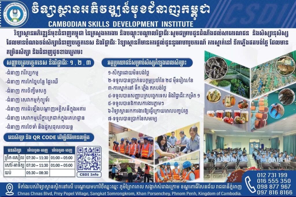(ភ្នំពេញ)៖ វិទ្យាស្ថានអភិវឌ្ឍន៍មុខជំនាញកម្ពុជា នៃក្រសួងការងារ និងបណ្តុះបណ្តាលវិជ្ជាជីវៈ ផ្តល់អាហារូបករណ៍ចំនួន ៦៩០កន្លែង លើ ៧មុខជំនាញ ដល់យុវជនមកពីគ្រួសារក្រីក្រ និងគ្រួសារងាយរងហានិភ័យ ព្រមទាំងផ្ដល់ប្រាក់ឧបត្ថម្ភប្រចាំខែក្រោមកម្មវិធីបណ្តុះបណ្តាលជំនាញវិជ្ជាជីវៈ និងបច្ចេកទេសដល់យុវជនមកពីគ្រួសារក្រីក្រ និងគ្រួសារងាយរងហានិភ័យ (TVET 1.5M)។ សម្រាប់ប្រជាពលរដ្ឋ និងយុវជន ដែលមិនមែនជាក្រុមគោលដៅ ក៏អាចស្នើចុះឈ្មោះចូលសិក្សាបានដោយឥតគិតថ្លៃផងដែរ ប៉ុន្តែមិនទទួលបានប្រាក់ឧបត្ថម្ភនោះឡើយ។