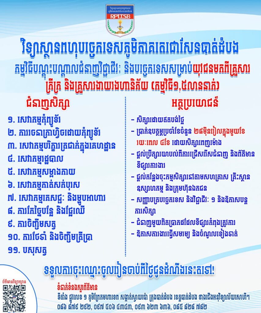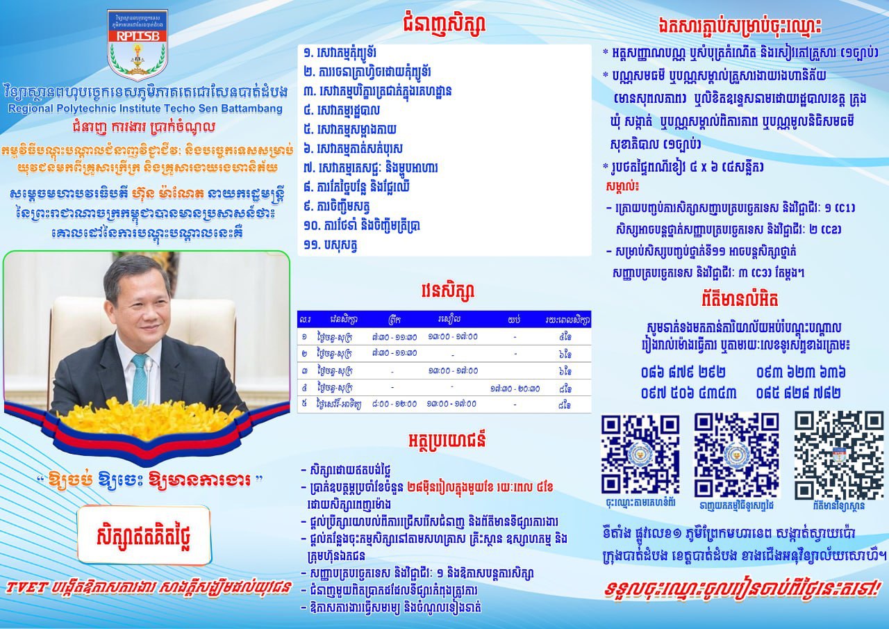 (ភ្នំពេញ)៖ វិទ្យាស្ថានពហុបច្ចេកទេសភូមិភាគតេជោសែនបាត់ដំបង នៃក្រសួងការងារ និងបណ្តុះបណ្តាលវិជ្ជាជីវៈ ផ្តល់អាហារូបករណ៍ចំនួន ១២ ៧៨០កន្លែង លើ ១១មុខជំនាញ សម្រាប់យុវជនមកពីគ្រួសារក្រីក្រ និងគ្រួសារងាយរងហានិភ័យ ព្រមទាំងផ្ដល់ប្រាក់ឧបត្ថម្ភប្រចាំខែក្រោមកម្មវិធីបណ្តុះបណ្តាលជំនាញវិជ្ជាជីវៈ និងបច្ចេកទេសដល់យុវជនមកពីគ្រួសារក្រីក្រ និងគ្រួសារងាយរងហានិភ័យ (TVET 1.5M)។ សម្រាប់ប្រជាពលរដ្ឋ និងយុវជន ដែលមិនមែនជាក្រុមគោលដៅ ក៏អាចស្នើចុះឈ្មោះចូលសិក្សាបានដោយឥតគិតថ្លៃផងដែរ ប៉ុន្តែមិនទទួលបានប្រាក់ឧបត្ថម្ភនោះឡើយ។