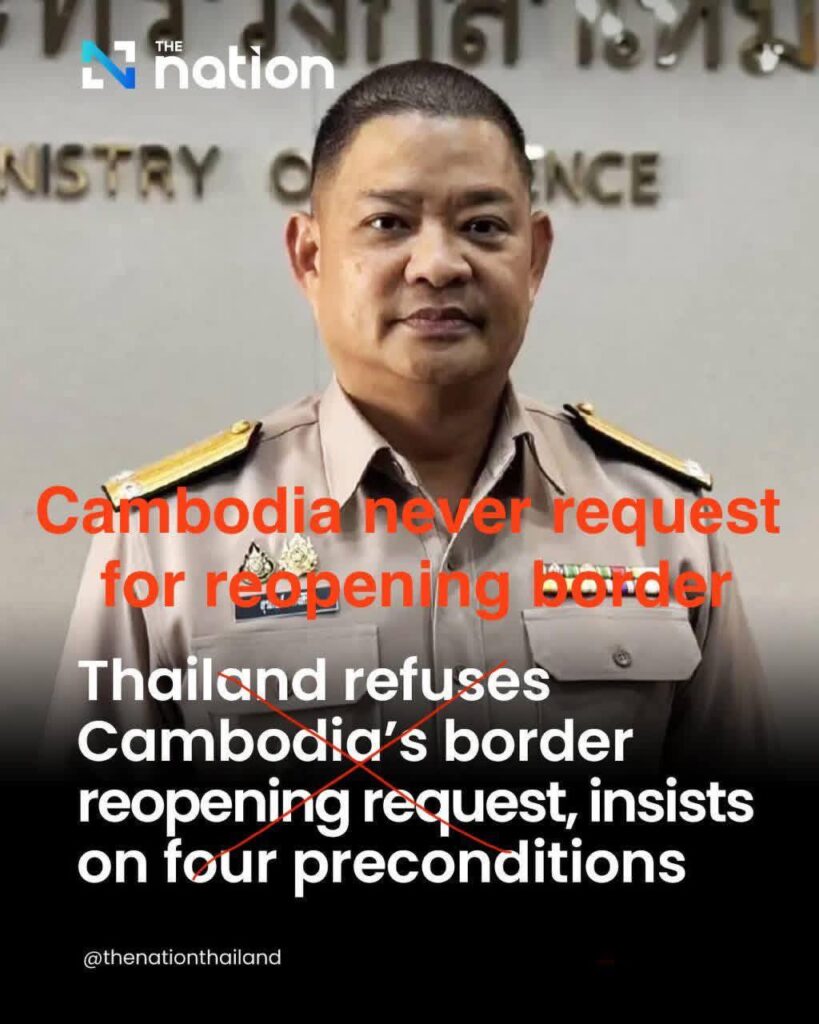 សូមបញ្ជាក់ ផងដែរថា កន្លងទៅ សម្ដេចតេជោ ធ្លាប់បានបញ្ជាក់ពីជំហររបស់សម្ដេច ជាបន្តបន្ទាប់ និងបានផ្សាយលើទំព័រហ្វេសប៊ុកផ្លូវការរបស់សម្ដេច កាលពីថ្ងៃទី២៣ កញ្ញា ២០២៥ កន្លងទៅថ្មីៗនេះទៀតថា “ ចាប់តាំងពីយោធាថៃបិទព្រំដែនជាឯកតោភាគីមក កម្ពុជាមិនដែលបានសុំភាគីថៃបើកច្រកវិញទេ គ្រាន់តែប្រាប់ទៅភាគីថៃថា (ថៃជាអ្នកបិទ ថៃគឺជាអ្នកបើក មិនបាច់ចរចាជាមួយកម្ពុជាទេ ហើយកម្ពុជានឹងបើកតាមក្រោយយ៉ាងយូរ៥ម៉ោង ) “ ។ ជំហរកម្ពុជានេះ នឹងមិនផ្លាស់ប្តូរទេ ហើយកម្ពុជាក៏មិនធ្វើថោកទៅសុំឱ្យបើកច្រកព្រំដែននោះដែរ។ ថៃអាចបន្តបិទសូម្បី១០០ឆ្នាំទៀតក៏កម្ពុជាមិនស្លាប់ ដែរ “ ៕