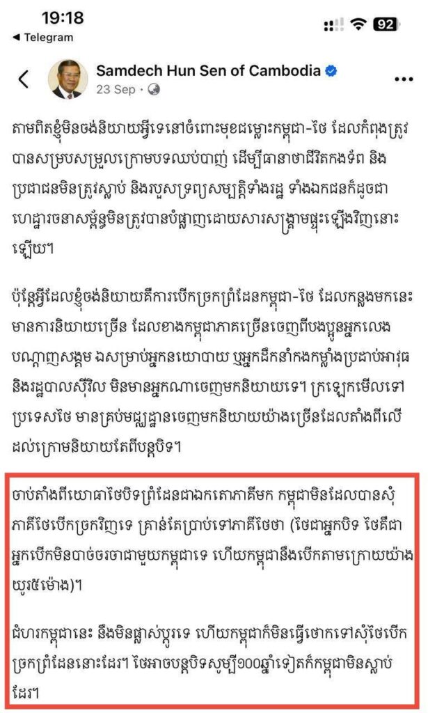 សូមបញ្ជាក់ ផងដែរថា កន្លងទៅ សម្ដេចតេជោ ធ្លាប់បានបញ្ជាក់ពីជំហររបស់សម្ដេច ជាបន្តបន្ទាប់ និងបានផ្សាយលើទំព័រហ្វេសប៊ុកផ្លូវការរបស់សម្ដេច កាលពីថ្ងៃទី២៣ កញ្ញា ២០២៥ កន្លងទៅថ្មីៗនេះទៀតថា “ ចាប់តាំងពីយោធាថៃបិទព្រំដែនជាឯកតោភាគីមក កម្ពុជាមិនដែលបានសុំភាគីថៃបើកច្រកវិញទេ គ្រាន់តែប្រាប់ទៅភាគីថៃថា (ថៃជាអ្នកបិទ ថៃគឺជាអ្នកបើក មិនបាច់ចរចាជាមួយកម្ពុជាទេ ហើយកម្ពុជានឹងបើកតាមក្រោយយ៉ាងយូរ៥ម៉ោង ) “ ។ ជំហរកម្ពុជានេះ នឹងមិនផ្លាស់ប្តូរទេ ហើយកម្ពុជាក៏មិនធ្វើថោកទៅសុំឱ្យបើកច្រកព្រំដែននោះដែរ។ ថៃអាចបន្តបិទសូម្បី១០០ឆ្នាំទៀតក៏កម្ពុជាមិនស្លាប់ ដែរ “ ៕