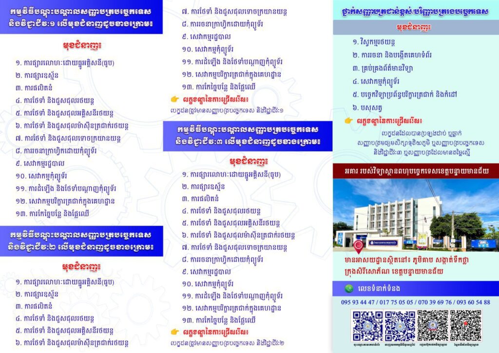 (ភ្នំពេញ)៖ វិទ្យាស្ថានពហុបច្ចេកទេសខេត្តបន្ទាយមានជ័យ នៃក្រសួងការងារ និងបណ្តុះបណ្តាលវិជ្ជាជីវៈ ផ្តល់អាហារូបករណ៍ចំនួន ២ ៣០០កន្លែង លើ ១៣មុខជំនាញ ដល់យុវជនមកពីគ្រួសារក្រីក្រ និងគ្រួសារងាយរងហានិភ័យ ព្រមទាំងផ្ដល់ប្រាក់ឧបត្ថម្ភប្រចាំខែក្រោមកម្មវិធីបណ្តុះបណ្តាលជំនាញវិជ្ជាជីវៈ និងបច្ចេកទេសដល់យុវជនមកពីគ្រួសារក្រីក្រ និងគ្រួសារងាយរងហានិភ័យ (TVET 1.5M)។ សម្រាប់ប្រជាពលរដ្ឋ និងយុវជន ដែលមិនមែនជាក្រុមគោលដៅ ក៏អាចស្នើចុះឈ្មោះចូលសិក្សាបានដោយឥតគិតថ្លៃផងដែរ ប៉ុន្តែមិនទទួលបានប្រាក់ឧបត្ថម្ភនោះឡើយ។