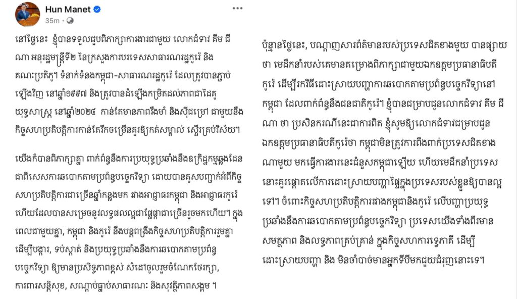 សម្ដេចធិបតី ហ៊ុន ម៉ាណែត បានលើកឡើងថា នៅថ្ងៃនេះ សម្ដេច បានទទួលជួបពិភាក្សាការងារជាមួយ លោកជំទាវ គីម ជីណា អនុរដ្ឋមន្ត្រីទី២ នៃក្រសួងការបរទេសសាធារណរដ្ឋកូរ៉េ និងគណៈប្រតិភូ ។ ទំនាក់ទំនងកម្ពុជា-សាធារណរដ្ឋកូរ៉េ ដែលត្រូវបានភ្ជាប់ឡើងវិញ នៅឆ្នាំ១៩៩៧ និងត្រូវបានដំឡើងកម្រិតដល់ភាពជាដៃគូយុទ្ធសាស្ត្រ នៅឆ្នាំ២០២៤ កាន់តែមានភាពរឹងមាំ និងស៊ីជម្រៅ ជាមួយនឹងកិច្ចសហប្រតិបត្តិការកាន់តែរីកចម្រើន គួរឱ្យកត់សម្គាល់ស្ទើរគ្រប់វិស័យ ។