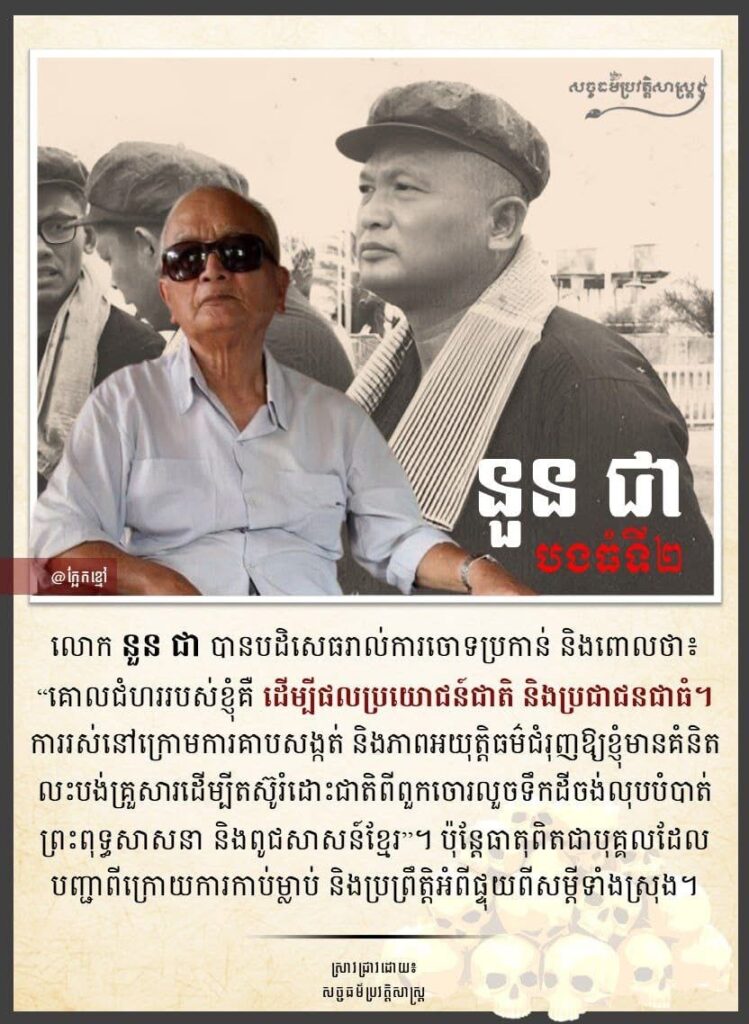 លោក នួន ជា បានបដិសេធរាល់ការចោទប្រកាន់ និងពោលថា៖ គោលជំហរបស់ខ្ញុំគឺ ដើម្បីផលប្រយោជន៍ជាតិ និងប្រជាជនជាធំ។ ការរស់នៅក្រោមការគាបសង្កត់ និងភាពអយុត្តិធម៌ជំរុញឱ្យខ្ញុំមានគំនិតលះបង់គ្រួសារដើម្បីតស៊ូរំដោះជាតិពីពួកចោរលួចទឹកដីចង់លុបបំបាត់ព្រះពុទ្ធសាសនា និងពូជសាសន៍ខ្មែរ។ ប៉ុន្តែធាតុពិតជាបុគ្គលដែលបញ្ជាពីក្រោយការកាប់សម្លាប់ និងប្រព្រឹត្តិអំពើផ្ទុយពីសម្តីទំាងស្រុង។