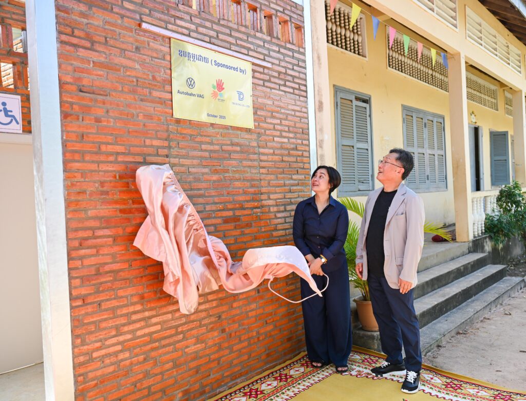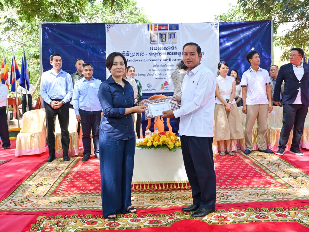 (កំពង់ធំ)៖ លោកគ្រូ-អ្នកគ្រូ និងសិស្សានុសិស្ស នៅវិទ្យាល័យតាំងក្រសាំង ស្ថិតនៅស្រុកសន្ទុក ខេត្តកំពង់ធំ ទទួលបានអគារបន្ទប់ទឹកស្អាត ដែលជាសមិទ្ធផលថ្មី នៃការចូលរួមលើកកម្ពស់បញ្ហាសុខភាព និងបរិស្ថាននៅក្នុងសាលារៀន ក្រោមគម្រោងគាំទ្រពី Autobahn VAG និង Tri Dong ។