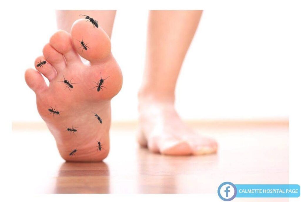 - ភាពស្ពឹក ស្រពន់ដៃជើង , ដូចស្រមោចវារ (Paresthésie des extrémités à type de picotement et fourmillements)
