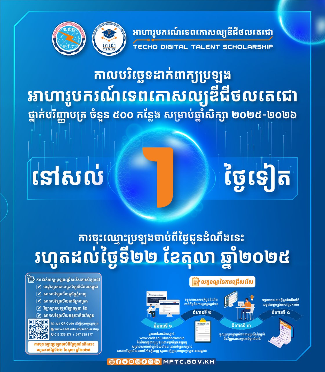 នៅសល់ពេល ១ថ្ងៃទៀត ផុតកំណត់កាលបរិច្ឆេទនៃការចុះឈ្មោះដាក់ពាក្យប្រឡង អាហារូបករណ៍ទេពកោសល្យឌីជីថលតេជោ ថ្នាក់បរិញ្ញាបត្រ ចំនួន៥០០កន្លែង សម្រាប់ឆ្នាំ២០២៥-២០២៦ ហើយ!