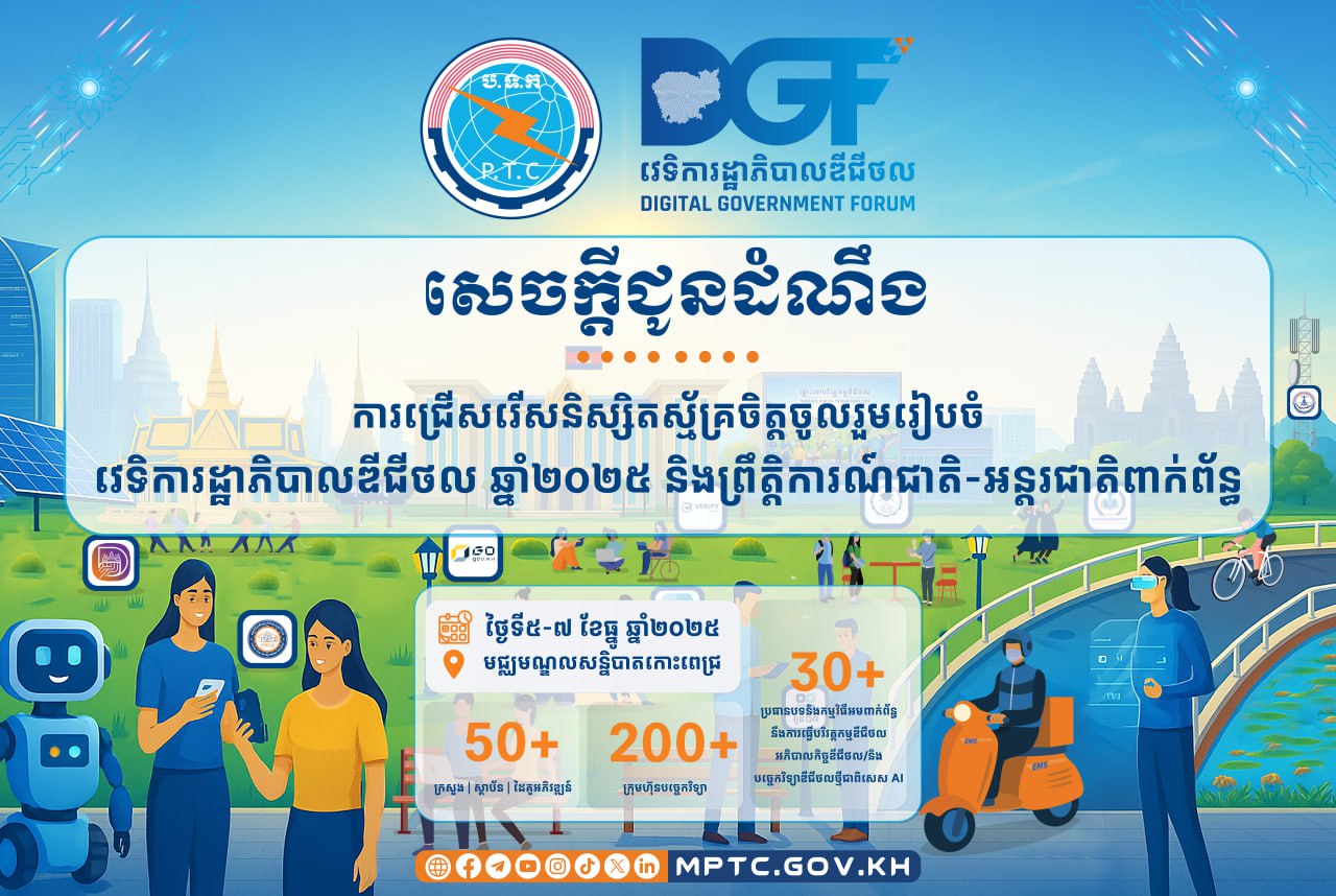 (ភ្នំពេញ)៖ ក្រសួងប្រៃសណីយ៍និងទូរគមនាគមន៍ ( ក.ប.ទ.) សូមជម្រាបជូនដល់និស្សិតដែលកំពុងសិក្សាជំនាញបច្ចេកវិទ្យាឌីជីថល ភាសាអង់គ្លេស ឬទំនាក់ទំនងអន្តរជាតិ ឱ្យបានជ្រាបថា ក.ប.ទ. នឹងរៀបចំ “វេទិការដ្ឋាភិបាលឌីជីថល ឆ្នាំ២០២៥ និងព្រឹត្តិការណ៍ជាតិ-អន្តរជាតិពាក់ព័ន្ធ” ក្រោមប្រធានបទ “ការពន្លឿនអនាគតឌីជីថល៖ អភិបាលកិច្ច កំណើន និងភាពជាដៃគូសកល” ដែលប្រព្រឹត្តទៅចាប់ពីថ្ងៃទី៥ ដល់ថ្ងៃទី៧ ខែធ្នូ ឆ្នាំ២០២៥ នៅមណ្ឌលសន្និបាតនិងពិព័រណ៍កោះពេជ្រ។