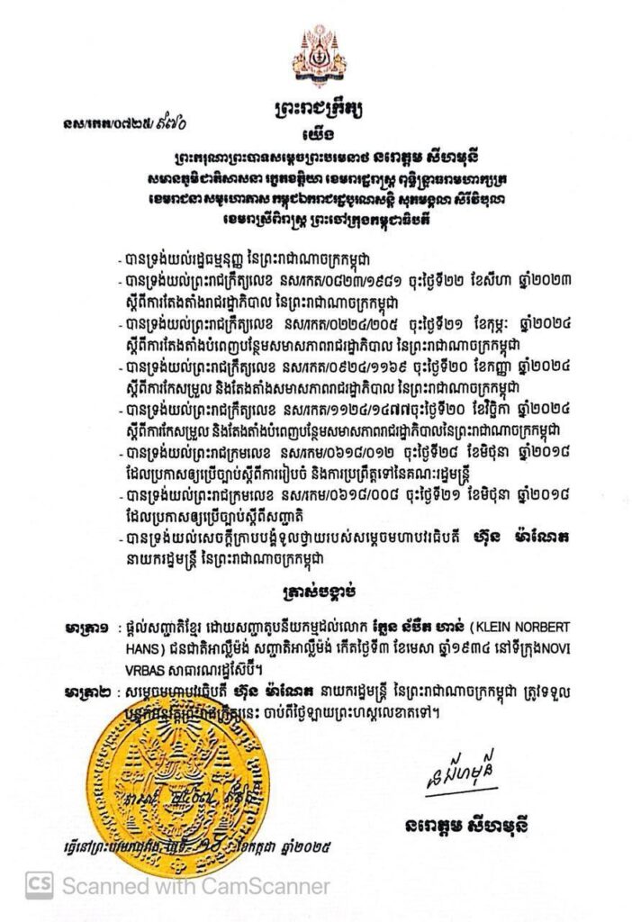 លោក ក្លែន ន័បឺត ហាន់(Klein Norbert Hans)ជនជាតិអាល្លឹម៉ង់សញ្ជាតិអាល្លឺម៉ង់ត្រូវបានព្រះករុណាព្រះបាទសម្តេចព្រះបរមនាថ នរោត្តម សីហមុនី ព្រះមហាក្សត្រ នៃព្រះរាជាណាចក្រកម្ពុជាត្រាស់បង្គាប់ ផ្តល់សញ្ជាតិខ្មែរ