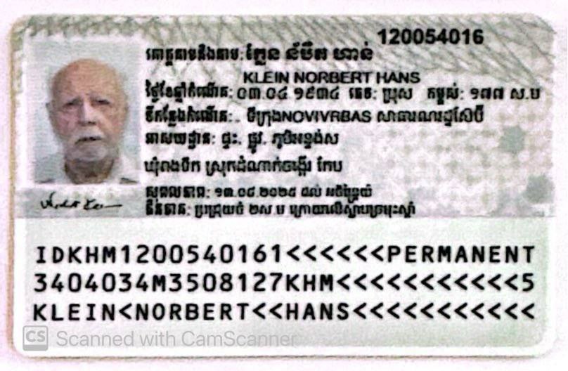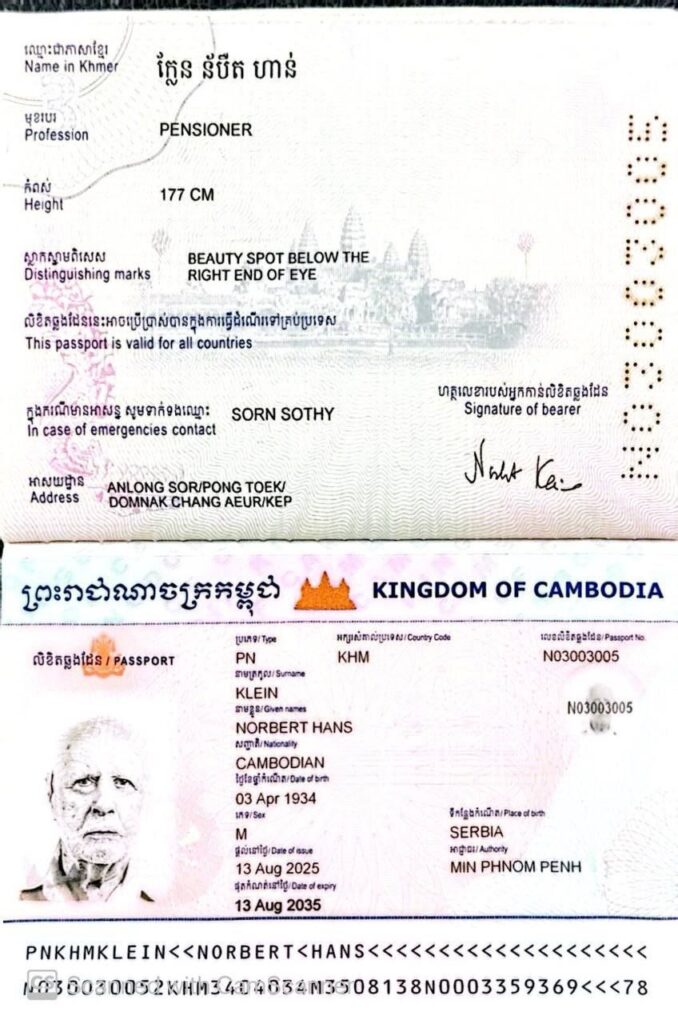 (ខេត្តកែប)៖ លោក ក្លែន ន័បឺត ហាន់(KLEIN NORBERT HANS) ជនជាតិអាល្លឺម៉ង់ សញ្ជាតិអាល្លឺម៉ង់ កេីតនៅថ្ងៃទី០៣ ខែមេសា ឆ្នាំ១៩៣៤ ទីក្រុង NOVIVRBAS សាធារណរដ្ឋស៊ែបី ត្រូវបានព្រះករុណាព្រះបាទសម្ដេចព្រះបរមនាថ នរោត្តម សីហមុនី ព្រះមហាក្សត្រនៃព្រះរាជាណាចក្រកម្ពុជា ត្រាស់បង្គាប់ ផ្ដល់សញ្ជាតិខ្មែរ តាមសេចក្ដីក្រាបបង្គំទូលថ្វាយរបស់សម្ដេចមហាបវរធិបតី ហ៊ុន ម៉ាណែត នាយករដ្ឋមន្ត្រីនៃព្រះរាជាណាចក្រកម្ពុជា បន្ទាប់ពីរូបលោកបានកសាងស្នាដៃជាច្រេីនជួយរាជរដ្ឋាភិបាលកម្ពុជា និងសង្គមជាតិកម្ពុជា អស់ជាច្រើនឆ្នាំកន្លងមកនេះ។