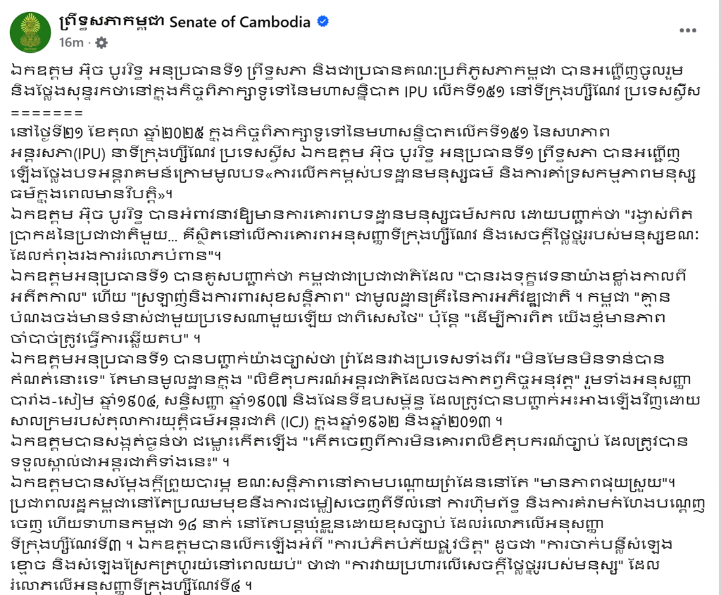 ការលើកឡើងបែបនេះរបស់ឯកឧត្តម អ៊ុច បូររិទ្ធ បានធ្វើឡើងនៅឱកាសអញ្ជើញថ្លែងក្នុងកិច្ចពិភាក្សាទូទៅ នៃមហាសន្និបាតលើកទី១៥១ នៃសហភាពអន្តរសភា(IPU) ទីក្រុងហ្សឺណែវ ប្រទេសស្វីស នៅថ្ងៃទី២១ ខែតុលា ឆ្នាំ២០២៥នេះ ក្រោមប្រធានបទដ៏មានសារៈសំខាន់ស្ដីពី «ការលើកកម្ពស់បទដ្ឋានមនុស្សធម៌ និងការគាំទ្រសកម្មភាពមនុស្សធម៌ក្នុងពេលមានវិបត្តិ»។